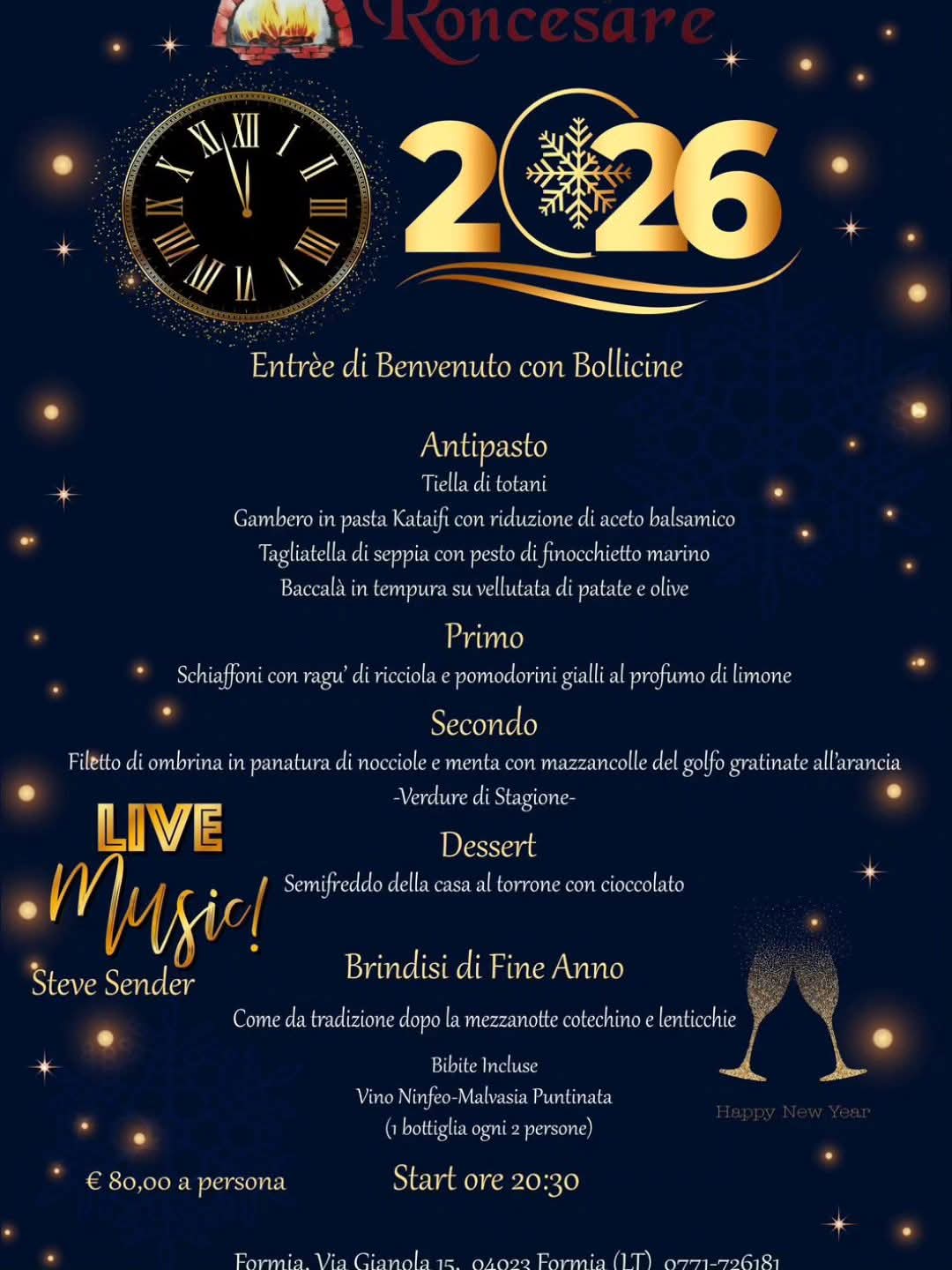 Durante la cena e nell’attesa della mezzanotte, gli ospiti saranno accompagnati dalla musica dal vivo di Steve Sender, per un’atmosfera festosa pensata per accogliere il nuovo anno tra divertimento e convivialità. Il ristorante Roncesare, situato in Via Gianola 15 a Formia (LT), ha aperto le prenotazioni e si prepara a ospitare una serata speciale dedicata a chi desidera salutare il 2025 con stile, gusto e buona musica. Per contatti: 0771.726181 Di seguito la locandina dell’evento: