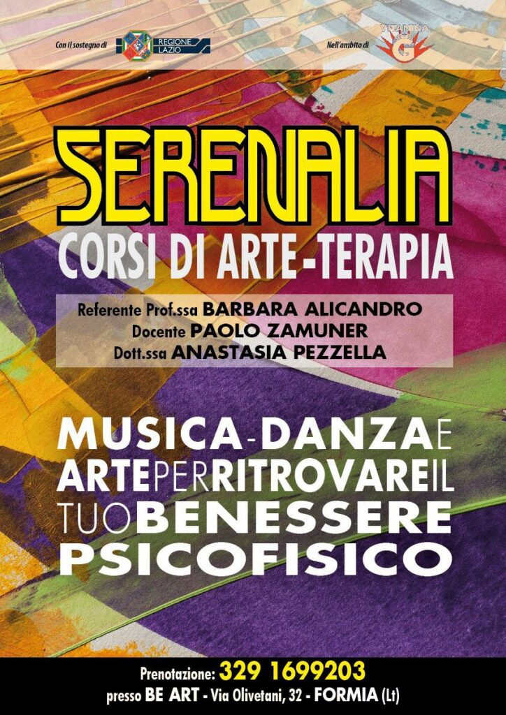 Serenalia, un percorso di arteterapia gratuito: ritrovare il benessere psicofisico attraverso danza, musica e arte – Serenalia è un percorso di arteterapia per ritrovare il benessere psicofisico attraverso incontri e seminari dedicati alla danza, alla musica e all’arte. PRIMI INCONTRI 20 Maggio Ore 15:00/ 17:00 10 Giugno Seminario Ore 16:00/18:00 15 Luglio Seminario Ore 10:30/12:30 12 Agosto Seminario 10:30/12:30. Be Art, Via Olivetani 32 Formia È obbligatoria la prenotazione e il percorso è interamente gratuito. Docenti Barbara Alicandro ( movimento e arte / terapia) Anastasia Pezzella ( psicologa -psicoterapeuta ) Paolo Zamuner ( musico- Terapia). Progetto Vincitore Vitamina G con il sostegno della Regione Lazio.