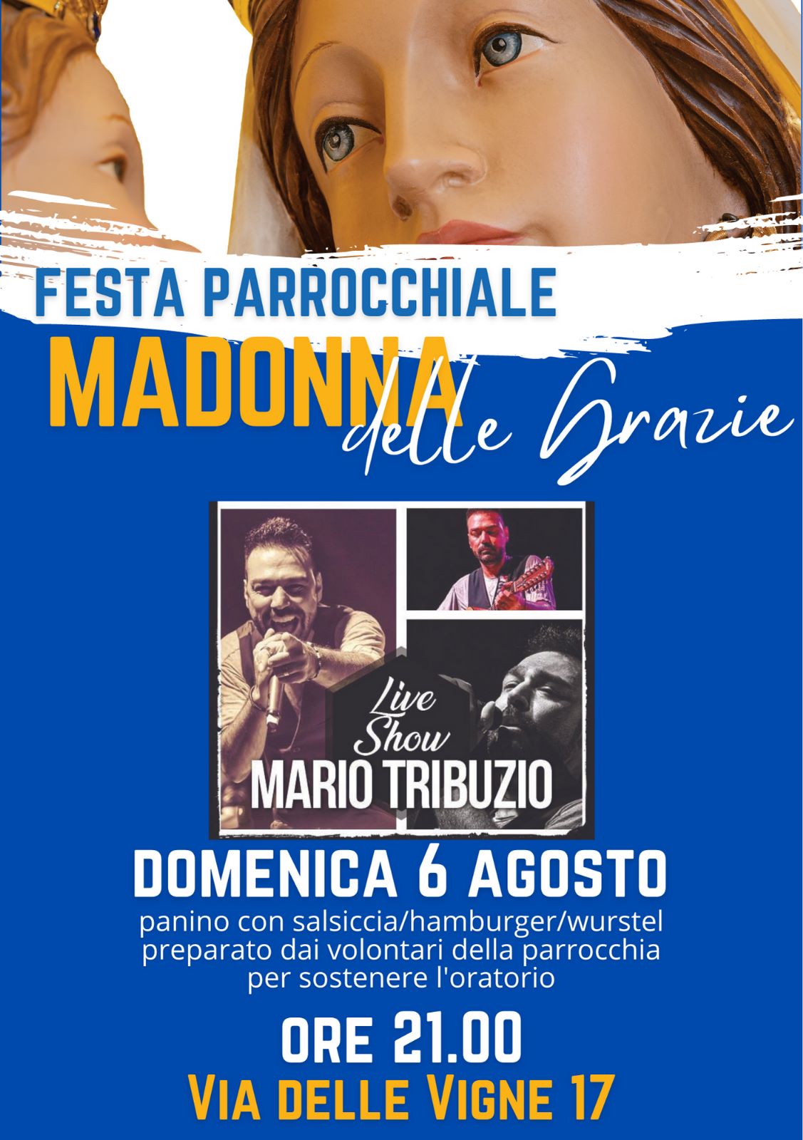Gianola: Domenica 6 Agosto Mario Tribuzio live – In occasione della Festa Parrocchiale di Madonna delle Grazie, a Gianola il prossimo 6 agosto alle ore 21:00 andrà in scena Mario Tribuzio. Presiederà, dai volontari, un angolo gastronomico con salsiccia, hamburger e wurstel per sostenere l’oratorio.