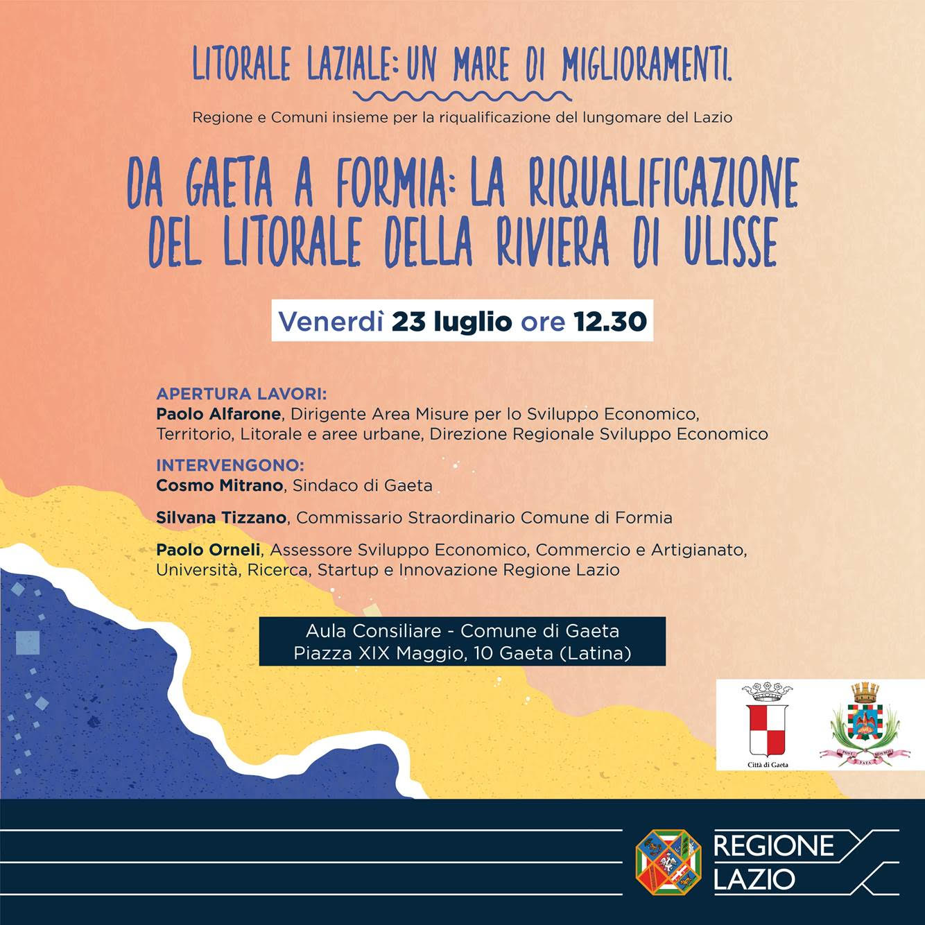 Il Sindaco Cosmo Mitrano presenzierà alla conferenza stampa di presentazione del progetto “Litorale laziale: un mare di miglioramenti” alla presenza dell’Assessore Sviluppo Economico, Commercio e Artigianato della Regione Lazio Paolo Orneli, in programma venerdì 23 luglio alle ore 12:30 presso l’aula consiliare del Comune di Gaeta.