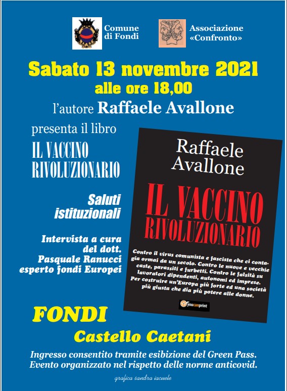 FONDI, IL VACCINO RIVOLUZIONARIO – Si terrà sabato 13 novembre, a partire dalle 18:00, presso la sala conferenze del Castello Caetani, la presentazione dell’ultimo libro di Raffaele Avallone intitolato “Il vaccino rivoluzionario”. L’evento, promosso dall’Associazione Confronto e patrocinato dal Comune di Fondi, si svolgerà nel rispetto delle normative anti-Covid19. L’accesso in sala sarà consentito soltanto ai cittadini muniti di green pass.