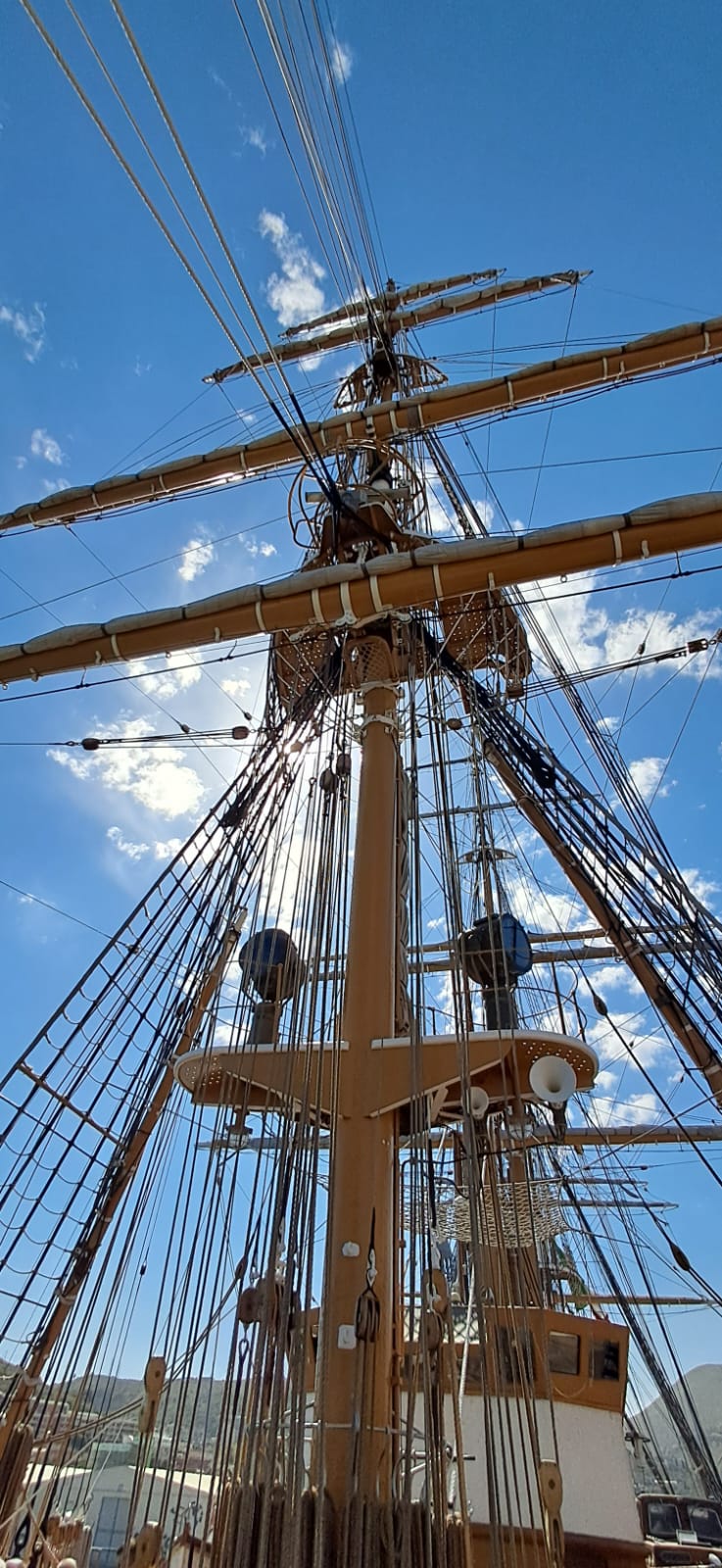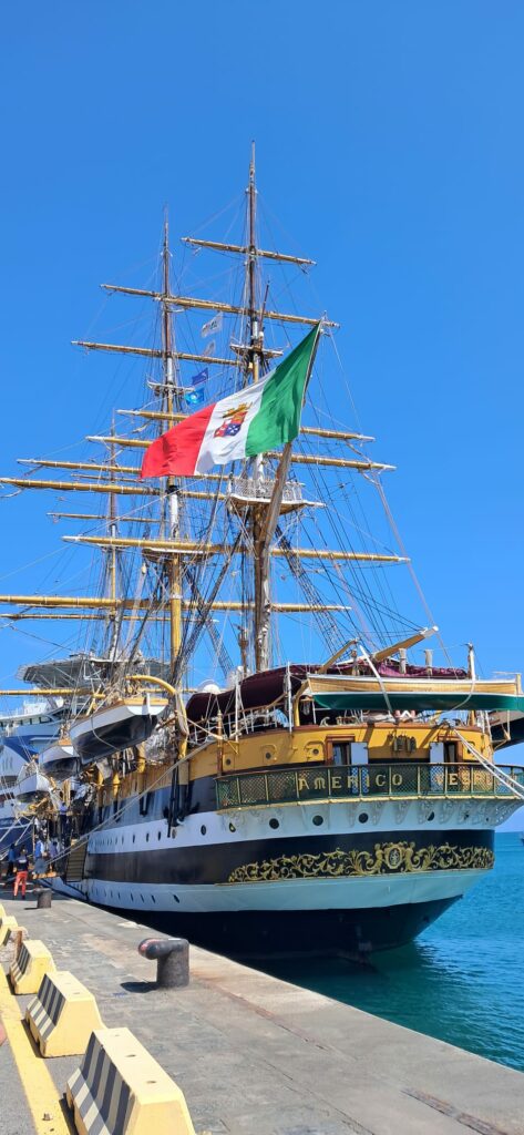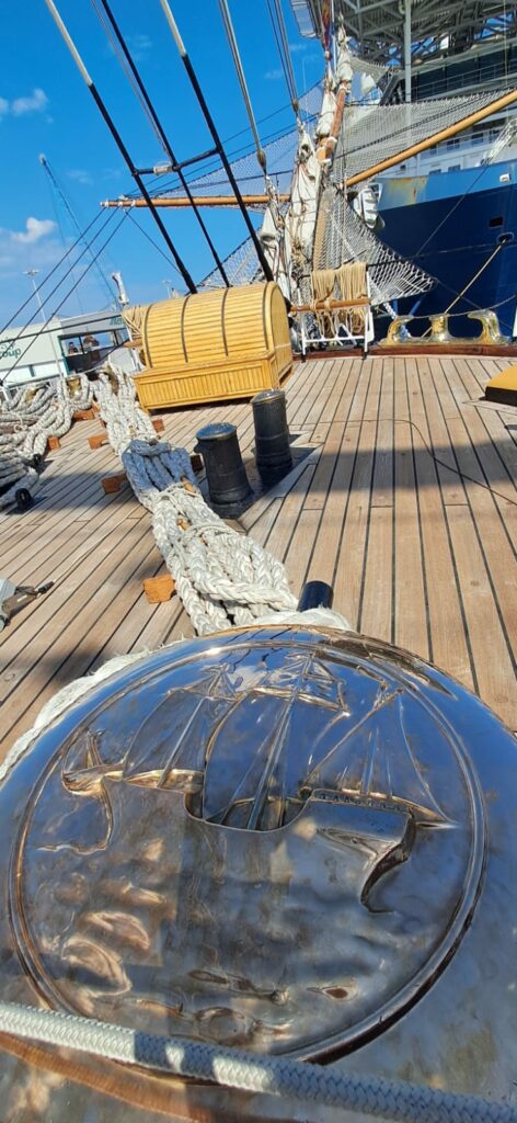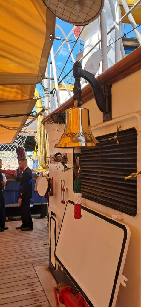 L’accoglienza è stata impeccabile. La fila per salire era ben organizzata e scorrevole. E poi, il momento tanto atteso: il primo passo sul ponte. È come varcare una soglia temporale, lasciandosi alle spalle il presente per entrare in una dimensione fatta di legno, vele e storia. Ogni dettaglio della Vespucci – dai fregi dorati al suo scafo bicolore, dai pennoni svettanti agli odori di salsedine e cordame – parla una lingua antica, che racconta di tradizione, onore e passione. Ogni trave di legno e ogni corda odorano di tradizione, fatica, orgoglio.