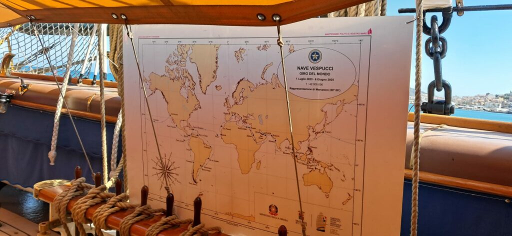 Il giro del mondo ha toccato alcuni tra i più significativi scali internazionali, attraversando oceani, culture e continenti. Un viaggio di 46.000 miglia e 30 paesi toccati. Partita da Genova, la nave ha fatto tappa nei porti di Marsiglia, Las Palmas, Dakar, e Praia, per poi approdare nelle Americhe: Santo Domingo, Cartagena, Trinidad e Tobago, Brasile, Argentina, Uruguay e fino alla punta estrema di Ushuaia. Dopo aver costeggiato il Pacifico da Valparaiso a Los Angeles, il viaggio è proseguito verso l’Asia, passando per Giappone, Filippine, Australia, Singapore, India e Medio Oriente, fino a concludersi nuovamente in Mediterraneo, ad Alessandria d’Egitto.