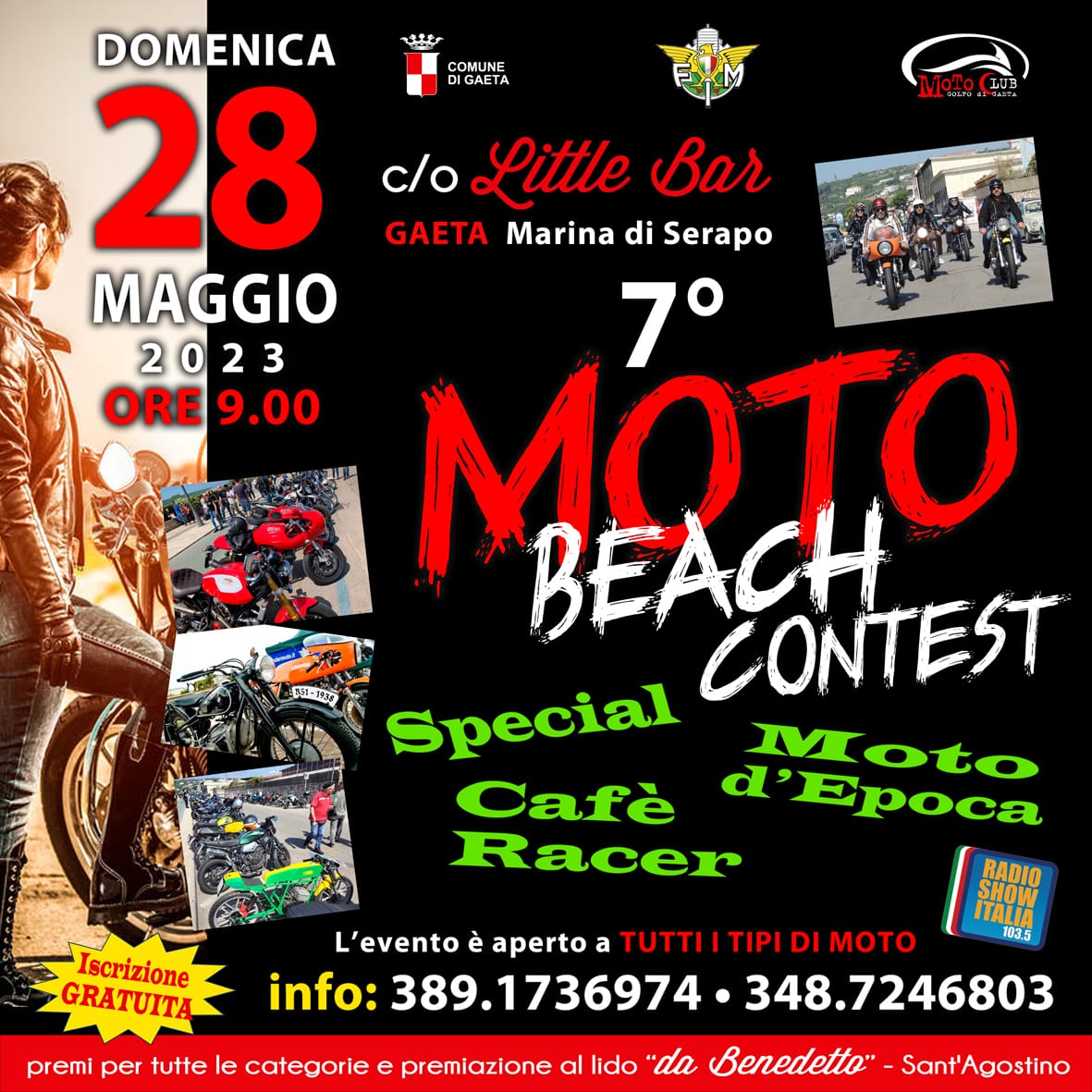 Gaeta, 7° moto Beach contest – Il settimo moto Beach contest si terrà a Gaeta domenica 14 maggio 2023 sul lungomare della spiaggia di Serapo dalle ore 9:00 alle 13:00 “Little Bar”. Organizzato dal motoclub Gaeta per domenica 28 maggio dalle ore 9:00 alle 13:00 è aperta a tutte le categorie con ISCRIZIONE GRATUITA …..è un occasione per incontrare amici con la passione delle 2 ruote, inoltre per le categorie “special” “cafè racer” e “moto d’epoca “ ci saranno ricchi premi per le moto più particolari offerti dal motoclub Gaeta