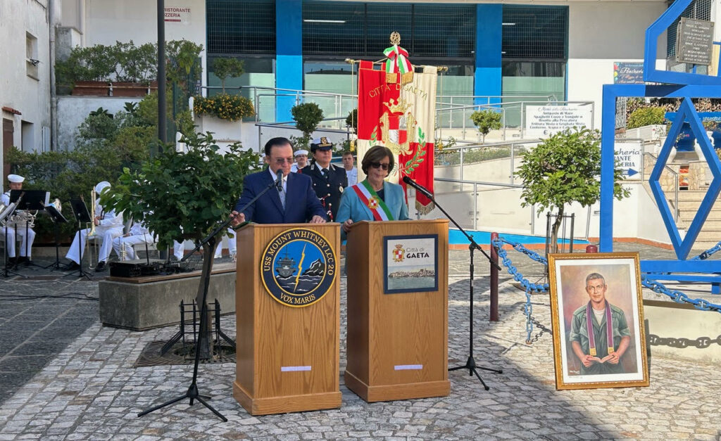 Sono stati gli interventi del Comandante della Nave Ammiraglia della VI Flotta statunitense Mount Whitney, Capitano di vascello Matthew Kiser, e del Vicesindaco di Gaeta Teodolinda Morini, a caratterizzare la cerimonia commemorativa del 56° anniversario della scomparsa del Cappellano della Marina americana, Vincent Capodanno, svoltasi in Piazza Capodanno alla presenza di autorità militari, civili e ad un folto pubblico. Il sacerdote e missionario cattolico di origini gaetane perse la vita in Vietnam mentre, in campo di battaglia, somministrava i sacramenti e confortava i Marines feriti o moribondi. Qualche anno dopo la sua morte, fu insignito postumo della Medaglia d’Onore del Congresso, valente alla medaglia d’Oro conferita in Italia dal Presidente della Repubblica. Oltre al Quintetto bandistico musicale della VI Flotta, che ha accompagnato i passaggi salienti della commemorazione con musiche appropriate, e alle preghiere di invocazione e benedizione recitate dal Capitano di Corvetta cappellano della Mount Whitney Dru Nelson, la cerimonia – condotta nelle due lingue dal Capo di Gabinetto del Sindaco, Roberto Mari – ha fatto registrare anche la presenza di rappresentanti dell’Associazione “Vincent Capodanno” e delle Associazioni combattentistiche e d’Arma, come l’Istituto del Nastro Azzurro fra combattenti decorati al valor militare-sezione di Formia-Gaeta. «Quando Vincenzo Capodanno Senior – puntualizza il Vicesindaco Morini –, nato a Gaeta il 5 agosto 1881, lasciò l’Italia nel 1901, difficilmente avrebbe potuto immaginare che 89 anni dopo la sua partenza, la sua Città natale avrebbe intitolato una piazza, unica in tutto il territorio italiano, e due anni dopo (il 4 luglio 1992) un memoriale a suo figlio». Morini ha inoltre ringraziato il comandante Kiser «per averci dato l’opportunità di onorare la memoria di un eroe italo-americano, di un grande sacerdote di origini gaetane che ha dato la vita per gli altri. Siamo orgogliosi di celebrare la santità che questo Servo di Dio ha irradiato nel corso della sua breve vita ed anche dopo. Padre Capodanno sentiva il dovere di essere al servizio della gente. Nostro dovere è quello di ricordarlo». Eogiando l’altruismo e il coraggio di Padre Capodanno, il comandante Kiser ha sottolineato che «durante la più grande esercitazione marittima annuale BALTOPS 23 – condotta recentemente con alleati e partner della NATO nel Mar Baliamo ospitato cappellani della Marina provenienti da diverse nazioni, tra cui Belgio, Finlandia, Svezia e, naturalmente, Italia», ringraziando in chiusura tutti i presenti per la sentita partecipazione.