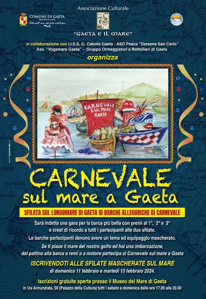 Gaeta, Carnevale: Rinviato a domenica 18 febbraio l’appuntamento con il Carnevale sul Mare! – Sfileranno imbarcazioni, pattini e barche a remi rigorosamente addobbate in stile allegorico. L’equipaggio sarà vestito a tema, come si vuole nella migliore tradizione del Carnevale. Al Carnevale sul Mare a Gaeta saranno premiate le tre imbarcazioni più innovative e originali. Non perdere l’occasione per vivere momenti di gioia e divertimento con il Carnevale sul mare!! Di seguito la locandina: