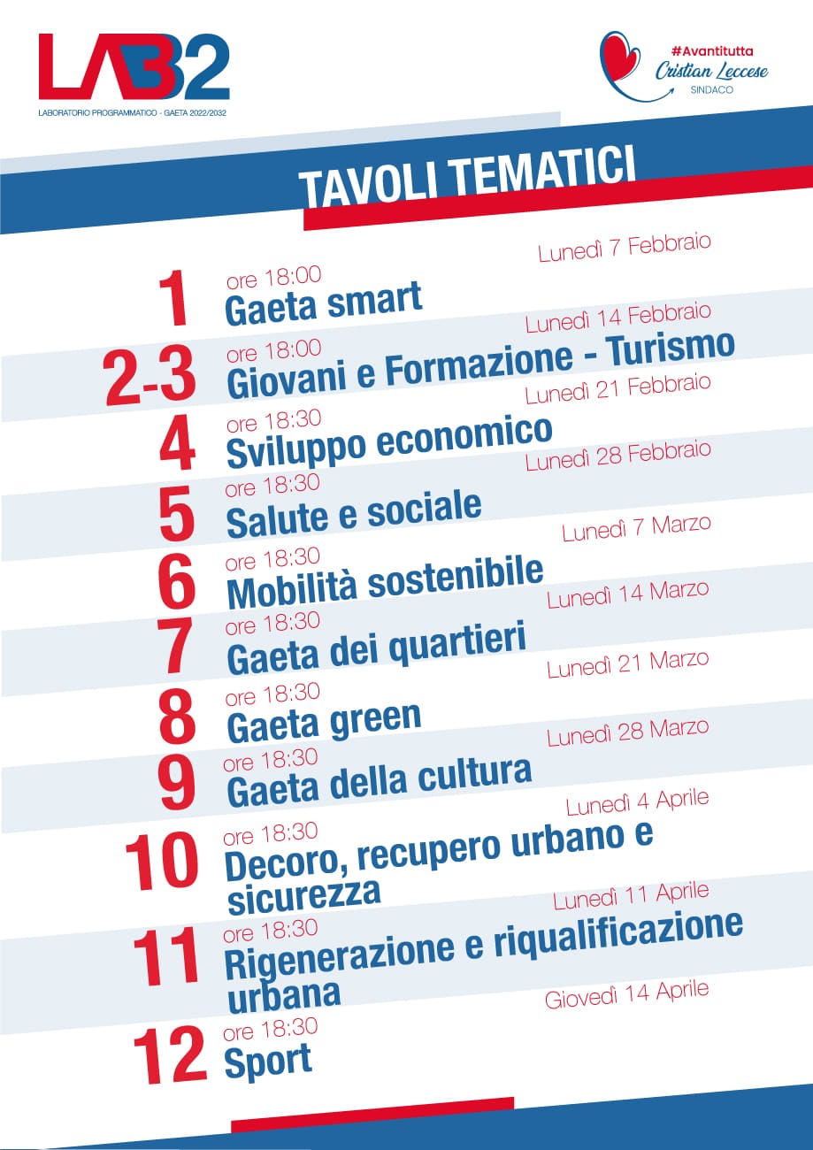 Il prossimo appuntamento con il LAB32 è per lunedì 21 febbraio, con il tavolo riguardante lo Sviluppo economico, a partire dalle ore 18:30. Il calendario degli incontri è stato riprogrammato rispetto a quanto inizialmente previsto, per permettere una maggiore partecipazione e concentrarsi in maniera più dettagliata sulle numerose tematiche da affrontare. Le prenotazioni sono aperte attraverso il form presente sul sito www.leccesesindaco.it, sezione LAB32 (www.leccesesindaco.it/lab32), inviando una mail all’indirizzo cristian@cristianleccese.it o un messaggio Whatsapp al numero 3939054647. In allegato il calendario degli eventi.
