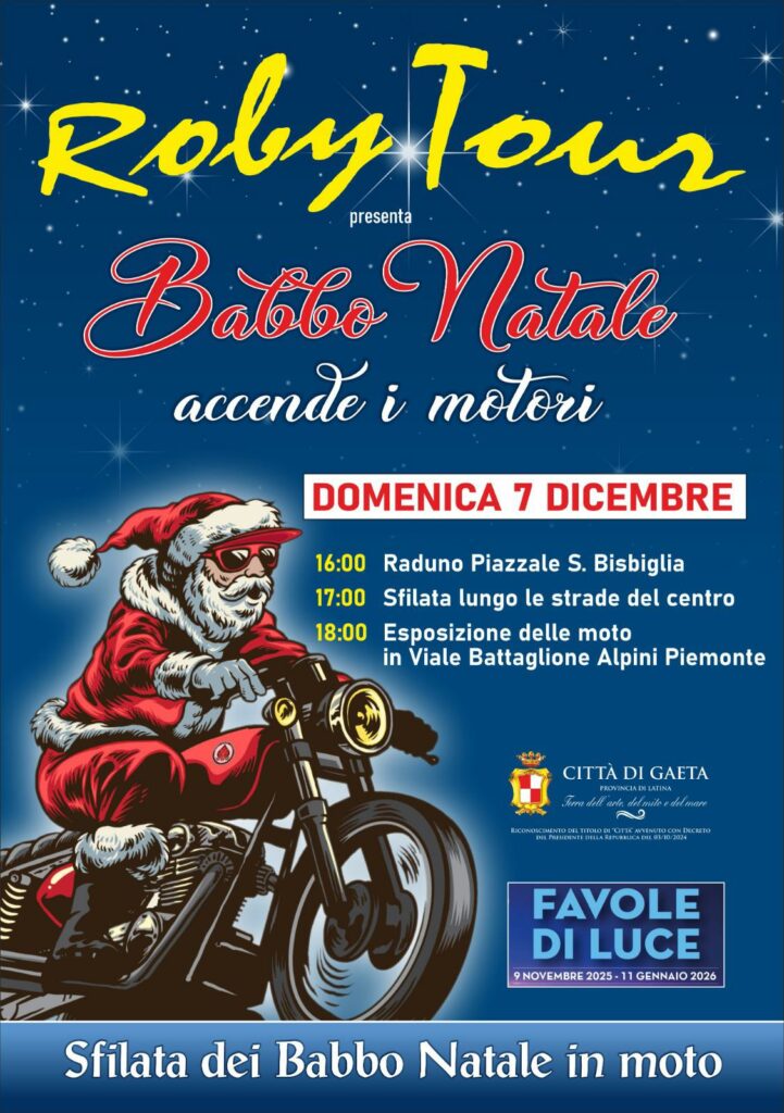 Gaeta, i Babbo Natale accendono i motori: il 7 dicembre torna la spettacolare sfilata su due ruote – Gaeta si prepara a vivere una delle iniziative più attese del periodo natalizio: la sfilata dei Babbo Natale in moto, un appuntamento che ogni anno richiama grandi e piccini lungo le vie del centro. L’evento, organizzato da Roby Tour in collaborazione con il Comune di Gaeta, animerà la città domenica 7 dicembre con un pomeriggio all’insegna dei colori natalizi, del rombo dei motori e dell’atmosfera festosa tipica delle Favole di Luce.