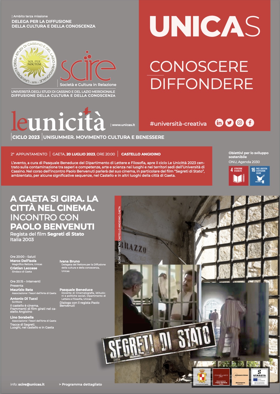 Giovedì 20 luglio 2023, con inizio dalle ore 20.00, si terrà, presso la sede Unicas del Castello Angioino di Gaeta, l’evento dal titolo “A Gaeta si gira. La città nel cinema: incontro con il regista Paolo Benvenuti”. L’evento apre la stagione “Unisummer. Movimento Cultura Benessere” del ciclo Le Unicittà 2023, centrato sulla contaminazione tra saperi e competenze, arte e scienza nei luoghi e nei territori sedi dell’Università di Cassino. Torna a Gaeta e al Castello Angioino il regista Paolo Benvenuti per un incontro a cura di Pasquale Beneduce del Dipartimento di Lettere e Filosofia – Unicas. L’occasione di questo appuntamento si lega alla celebrazione dei vent’anni trascorsi dal primo ciack della pellicola “Segreti di Stato” (Fandango, 2003), girata in parte nel castello di Gaeta. Il soggetto del film e la sceneggiatura (Paola Baroni, Paolo Benvenuti) si incentrano sul processo per la strage di Portella della Ginestra (1951): un avvocato decide di condurre una sua inchiesta sull’eccidio, rintracciando nuove tracce e testimonianze inascoltate. Il risultato delle indagini “parallele” porterà ad un’ipotesi totalmente differente da quella ufficiale, coinvolgendo le più alte cariche dello stato e non solo. La città di Gaeta viene coinvolta proprio per il carcere militare, da poco chiuso, ma molto simile alle carceri civili prima della riforma. Paolo Benvenuti, con l’ausilio di esperti locali, seleziona anche altri luoghi in città e ambienta nella città di Gaeta molteplici scene della sua pellicola. Dopo i saluti del Magnifico Rettore, Marco Dell’Isola, del Sindaco di Gaeta, Cristian Leccese e della Delegata per la Diffusione della Cultura e della Conoscenza, Ivana Bruno, si partirà da una panoramica dei film girati nel castello, con piccole clip raccolte a cura di Antonio Di Tucci, autore del volume “Gaeta è cinema” (Decomporre Edizioni). Di Tucci ha svolto nel corso degli ultimi anni un lavoro certosino recuperando informazioni, curiosità e tante altre informazioni relative ai film girati a Gaeta nel corso dell’ultimo secolo. Lino Sorabella, che da oltre 20 anni segue location per il cinema e all’epoca individuò buona parte dei luoghi utilizzati in Gaeta da Paolo Benvenuti, in quest’occasione mostrerà le tracce scenotecniche di “Segreti di Stato”, ancora presenti nel castello. Pasquale Beneduce, infine, dialogherà con Paolo Benvenuti sulla genesi del film e sui contenuti e le connessioni con Gaeta. Ci si soffermerà sulla scelta di girare alcune significative sequenze del film nel Castello e in altri luoghi della città di Gaeta, ormai set privilegiato dal cinema italiano. Il regista Paolo Benvenuti darà anche notizia in anteprima dei suoi prossimi impegni produttivi. Presenta la serata Maurizio Rata, presidente dell’associazione I Tesori dell’Arte: il sodalizio negli ultimi anni ha lavorato molto nel settore delle facilitazioni alle produzioni cinematografiche sul territorio del Basso Lazio.