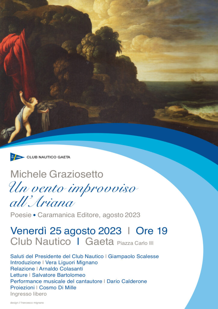 Venerdì 25 agosto con inizio alle ore 19.00 presso il Club Nautico di Gaeta lo scrittore e poeta Michele Graziosetto presenterà un suo libro di poesie edito da Armando Caramanica di Marina di Minturno. “Un vento improvviso all’Ariana. Il programma prevede i saluti del presidente del Club Nautico Giampaolo Scalesse, introduzione a cura di Vera Liguori Mignano, relazione di Arnaldo Colasanti, letture di Salvatore Bartolomeo, performance musicale del cantautore Dario Calderone, proiezioni di Cosmo Di Mille. Ingresso libero per una serata piacevole e interessante.