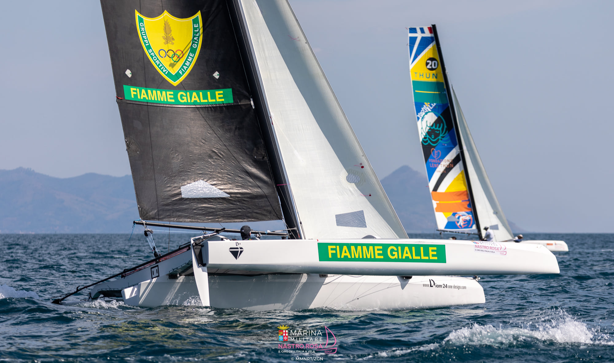 Il Team Fiamme Gialle di Gaeta impegnato nella categoria inshore, a bordo del trimarano Diam 24, raccoglie il primo successo di tappa nella regata costiera da Gaeta a Napoli, con l’equipaggio formato dal timoniere Giovanni Coccoluto, supportato da Pietro Zucchetti e Gianmarco Planchestainer, si è imposto sugli specialisti dell’Oman, dimostrando grande abilità tattica e strategica in una giornata non facile da interpretare a causa del vento leggero (8-10 nodi).