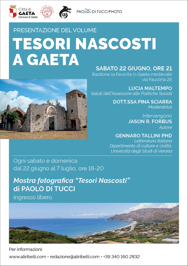 Sabato 22 giugno alle 21, presso la splendida cornice della batteria La Favorita, ATS La Cittadella e Ali Ribelli Edizioni presentano il nuovo libro dello scrittore Jason R. Forbus: `Tesori Nascosti a Gaeta`, un viaggio storico-sentimentale alla scoperta dei numerosi siti archeologici di epoca romana e medievale che puntellano l’agro gaetano.