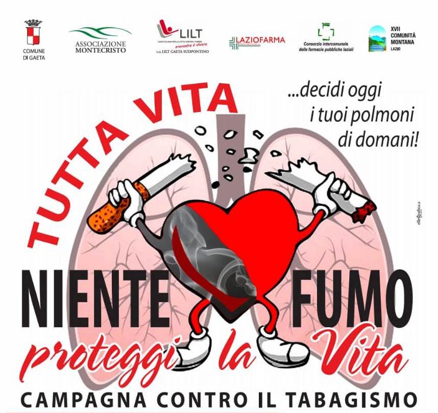 Gaeta, 20 febbraio 2019. “Niente fumo, proteggi la Vita”. Questo il titolo della campagna contro il tabagismo in programma venerdì 22 e sabato 23 febbraio. Due giorni dedicati alla prevenzione con incontri tenuti dal Dott. Ermanno Kugler, titolare di incarico “Alta Professionalità per la Broncopneumologia” – ASL Latina; dal Dott. Eugenio Daniele, Cardiologo. I due stimati ed illustri professionisti si rivolgeranno ad un platea giovane: gli studenti dell’I.C. “Principe Amedeo” e dell’I.C. “Giosuè Carducci” di Gaeta. Da diversi studi infatti è emerso che l’età anagrafica più sensibile è proprio quella che va dai 12-13 anni in su. Due giornate di sensibilizzazione di un evento che ha ottenuto il Patrocinio del Comune di Gaeta, dell’Associazione culturale “Monte Cristo”, della Lilt, della LazioFarma, del Coifal – Consorzio Intercomunale farmacie laziali, della XVII Comunità Montana dei “Monti Aurunci”.