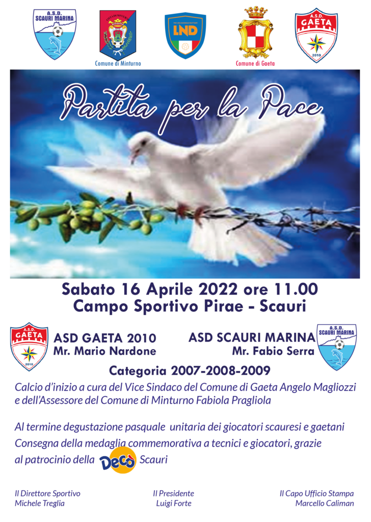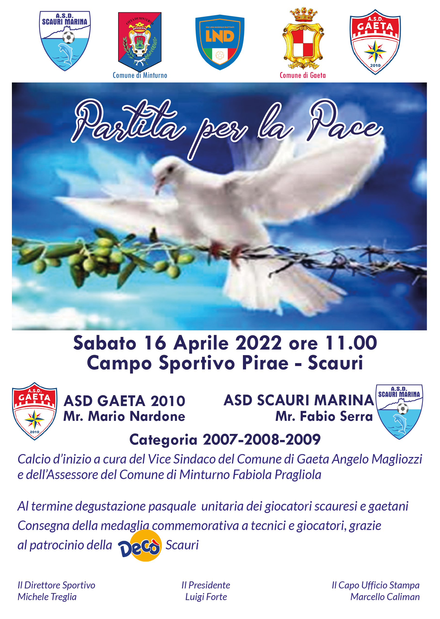 In una stupenda giornata primaverile, ricca di sole e allietata da un venticello marino, si è tenuta a Scauri la “Partita per la Pace” riconosciuta dalla Lega Nazionale Dilettanti e patrocinata dal Comune di Gaeta e dal Comune di Minturno. Una partita all’insegna dell’amicizia con calcio d’inizio dell’assessore minturnese Fabiola Pragnola tra l’ASD Gaeta 2010 e l’ASD Scauri Marina. L’evento sponsorizzato dalla Decò di Scauri. Ecco le loro formazioni. ASD Gaeta 2010: Noah Sebastiano Bazzanti, Davide Candido, Andrea Capobianco, Christian Mario Crocco, Giuseppe Fedele, Federico Gaudino, Kamer Markja, Andrea Pesce, Sergio Sommonte, Antonio Spagnardi, Giuseppe Colaruotolo, Luca Marzullo, Francesco Traniello allenati dal Mister Mario Nardone. ASD Scauri Marina: Samuel Mirra, Francesco Kajdo, Mario Di Bernardo, Francescao Russo, Federico Rizzo, Federico Cardi, David Morlando, Jacopo Calce, Jonas Noam Caliman, Antonio Granata, Jacopo Pontecorvo, Enzo Lucciola, Matteo Serra, Vittorio Conte, Paolo Carucci, Salvatore Martorelli, Gabryel Filosa, allenati dal Mister Fabio Serra. Tutti si sono impegnati in una partita non fallosa e fondamentalmente corretta. Si vince in undici e si perde in undici. Mister Fabio Serra ha utilizzato in porta tutti i suoi tre portieri a disposizione, anche i più piccoli, Samuel Mirra (1), Salvatore Martorelli e Enzo Lucciola. Tutti bravi. E ancora ha fatto scendere in campo tutta la rosa a disposizione.
