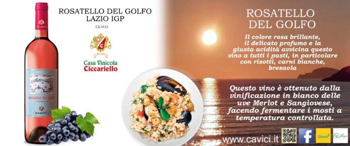 Rosatello del Golfo Lazio IGP, un vino che si abbina con tutti i pasti – Continua il nostro cammino di bacco nella prestigiosa cantina dei vini CA.VI.CI. (Casa Vinicola Ciccariello) di Gaeta con il vino Rosatello del Golfo. Questo vino è ottenuto dalla vinificazione in bianco delle uve Merlot e Sangiovese, facendo fermentare i mosti a temperatura controllata. Il colore rosa brillante, il delicato profumo e la giusta acidità avvicina questo vino a tutti i pasti, in particolare con risotti, carni bianche, bresaola. Servire alla temperatura di 12-14°C e stappare al momento della consumazione.