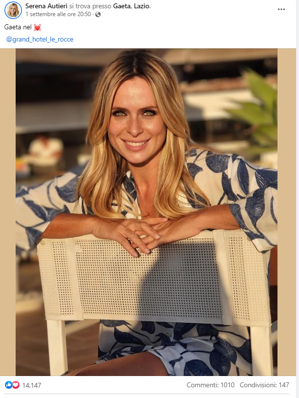Serena Autieri a Gaeta. La famosa attrice in vacanza nel nostro amato golfo – La famosa attrice Serena Autieri ha postato una foto sui social Instagram e Facebook scrivendo “Gaeta nel cuore” e taggando il prestigioso Grand hotel Le Rocce, luogo in cui ha passato qualche piacevole giornata. Come darle torto! Scegliere Gaeta è una garanzia in termini di vacanze tra sole, mare, cultura, relax e buona tavola. Il Grand hotel Le Rocce ha poi la peculiarità di essere un albergo con una spiaggia privata, le rocce situate a destra e sinistra della caletta rendono il luogo suggestivo e lontano da sguardi indiscreti. Il ristorante vista mare e il lussureggiante giardino arrecano inoltre un valore aggiunto alla struttura.