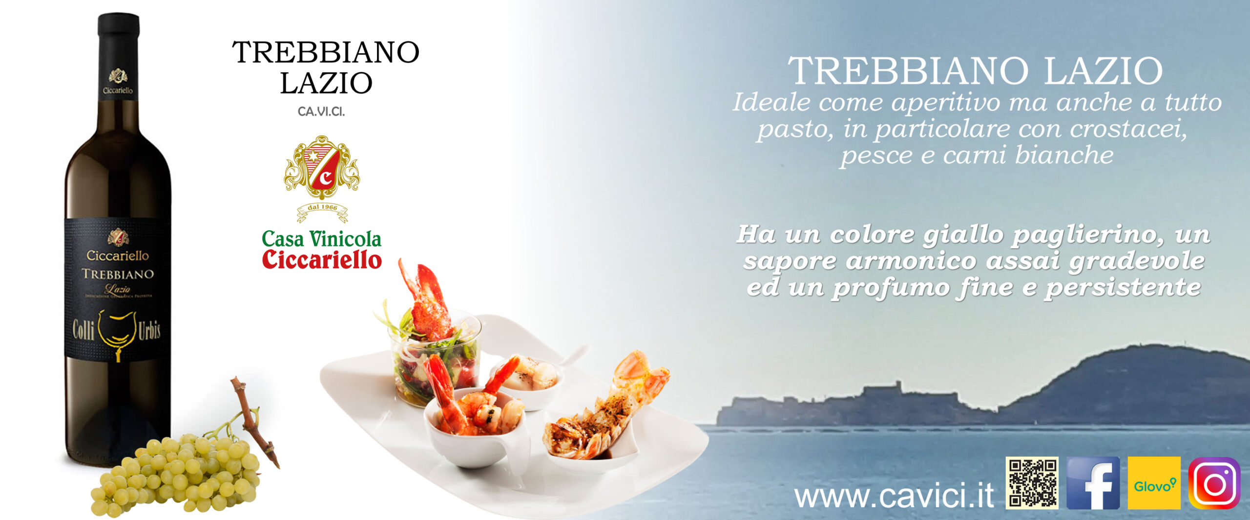 TREBBIANO LAZIO IGP CAVICI, sapore secco e delicato con sentori floreali – Continua il nostro cammino di bacco nella prestigiosa cantina dei vini CA.VI.CI. (Casa Vinicola Ciccariello) di Gaeta con il vino TREBBIANO LAZIO IGP CAVICI. Questo pregiato vino si ottiene dalla più attenta selezione di uve Trebbiano. Ha un colore giallo paglierino, un sapore armonico assai gradevole ed un profumo fine e persistente. Ideale come aperitivo ma anche a tutto pasto, in particolare con crostacei, pesce e carni bianche. Va servito fresco a 8-10 °C.