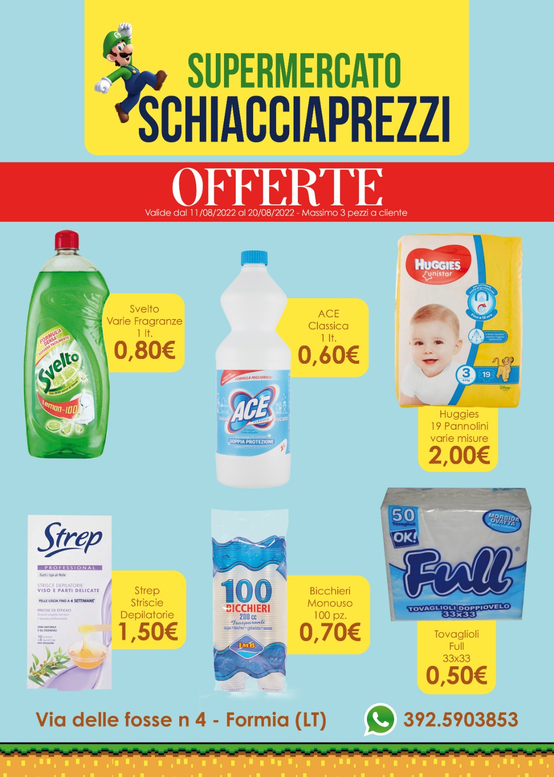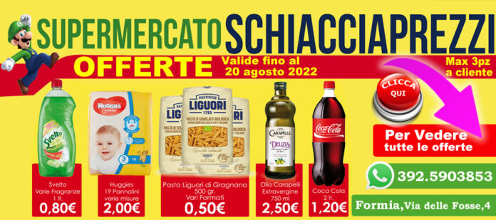 Formia: Il nuovo volantino di Schiacciaprezzi è ora disponibile – (comunicazione pubblicitaria) – Il Supermercato Schiacciaprezzi di Formia propone fino al 20 agosto 2022 un nuovo volantino visibile nelle immagini di seguito: