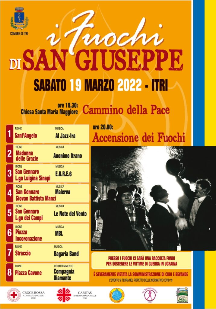 L’appuntamento è fissato per sabato 19 marzo 2022, quando alle ore 19:30 presso la Chiesa Santa Maria Maggiore, partirà il Cammino della Pace, mentre alle ore 20:00 un colpo di petardo indicherà l’accensione dei fuochi e l’inizio della festa. Per informazioni: facebook Tel. 0771.732207 – 0771.732208 www.comune.itri.lt.it cultura@comune.itri.lt.it
