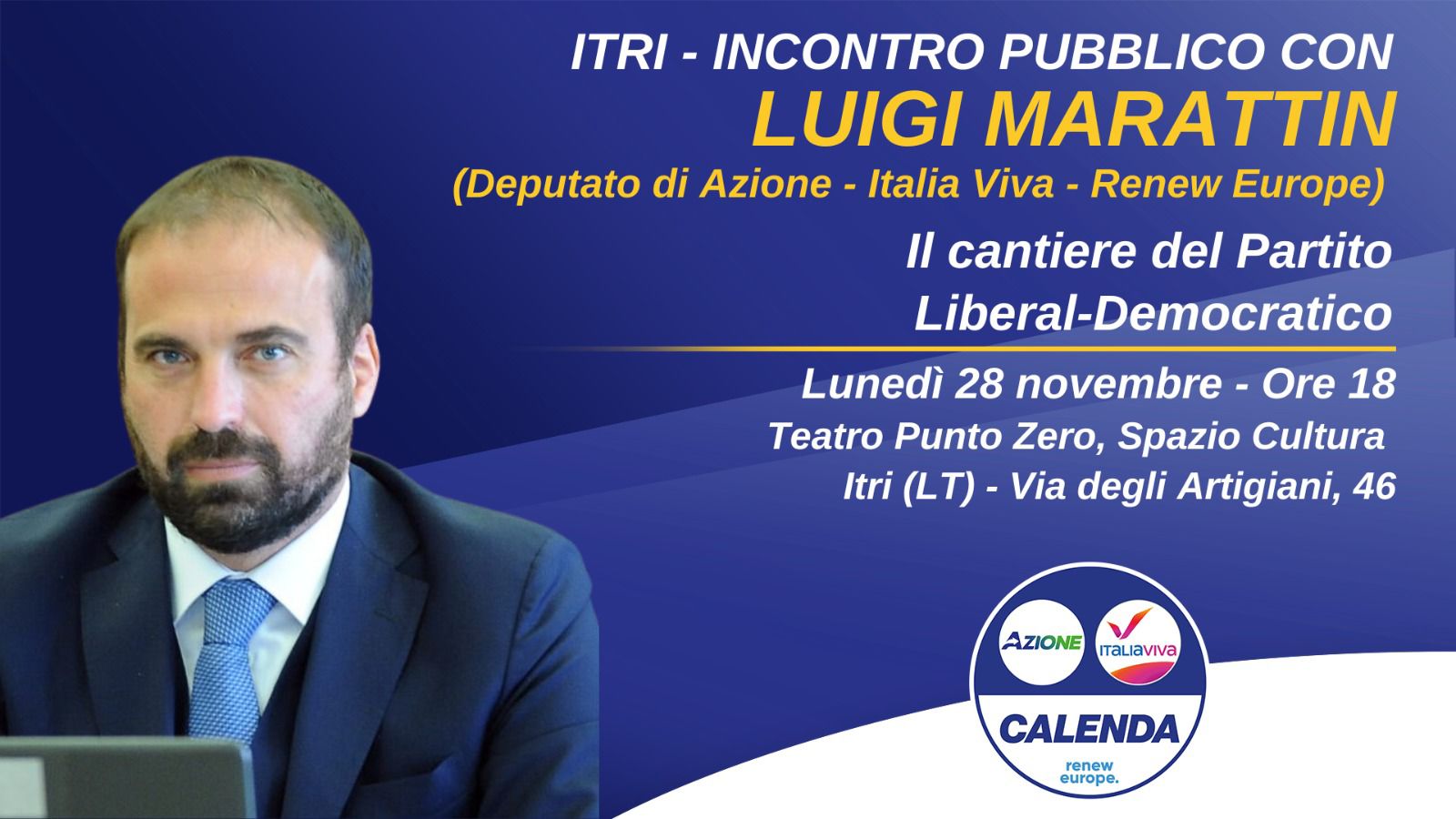 Itri: Incontro pubblico con Luigi Marattin – Questa sera, lunedì 28 novembre 2022, ore 18:00, incontro con Luigi Marattin, Deputato di Azione – Italia Viva, per la costruzione del circolo del Partito Liberal-Democratico a Itri. Ospite d’onore della serata sarà Gerardo Stefanelli, Presidente della Provincia di Latina e Sindaco di Minturno. Diversi gli interventi in programma da parte di imprenditori, giovani e membri della società civile itrana. Appuntamento questa sera lunedì 28 novembre 2022 ore 18 presso il Teatro Punto Zero – Spazio Cultura in via degli artigiani 46 a Itri.