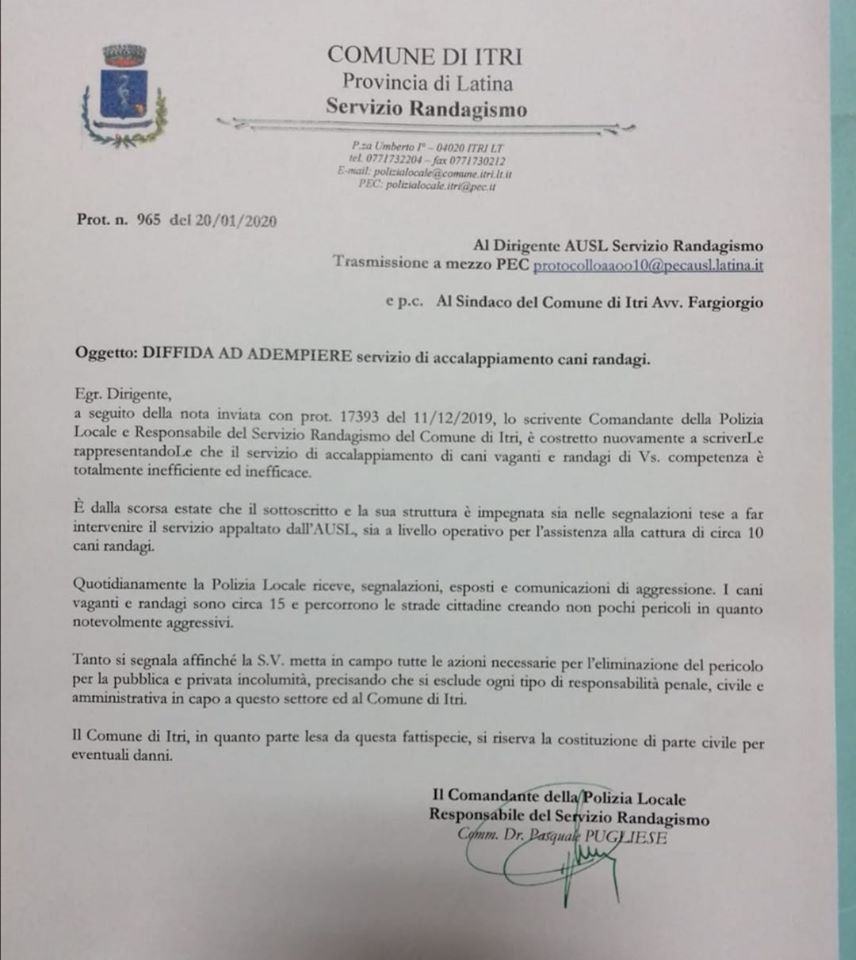 La diffida, datata 20/01/2020, prot. n° 965, notificata a mezzo posta elettronica certificata, ed inviata per conoscenza al Sindaco Fargiorgio, segnala alla ASL di Latina, il servizio di propria competenza di accalappiamento dei randagi inefficace ed inefficiente e diffida l’Azienda stessa a porre in essere tutte le azioni necessarie all’eliminazione del pericolo.