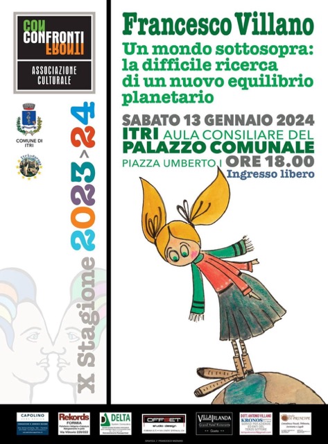 Sabato 13 Gennaio, alle ore 18:00, presso l’aula consiliare del palazzo Comunale di Itri in piazza Umberto I, riparte la 10 Stagione di Confronti con il quarto incontro tenuto dal socio fondatore Francesco Villano su un tema geopolitico di scottante attualità “Un mondo sottosopra: la difficile ricerca di un nuovo equilibrio planetario”. L’ordine mondiale, scaturito dalla fine della Seconda Guerra Mondiale (1945) è finito con la caduta del Muro di Berlino e la dissoluzione dell’Unione Sovietica (1989-1991). In questi ultimi 32 anni il disordine globale è andato progressivamente crescendo.