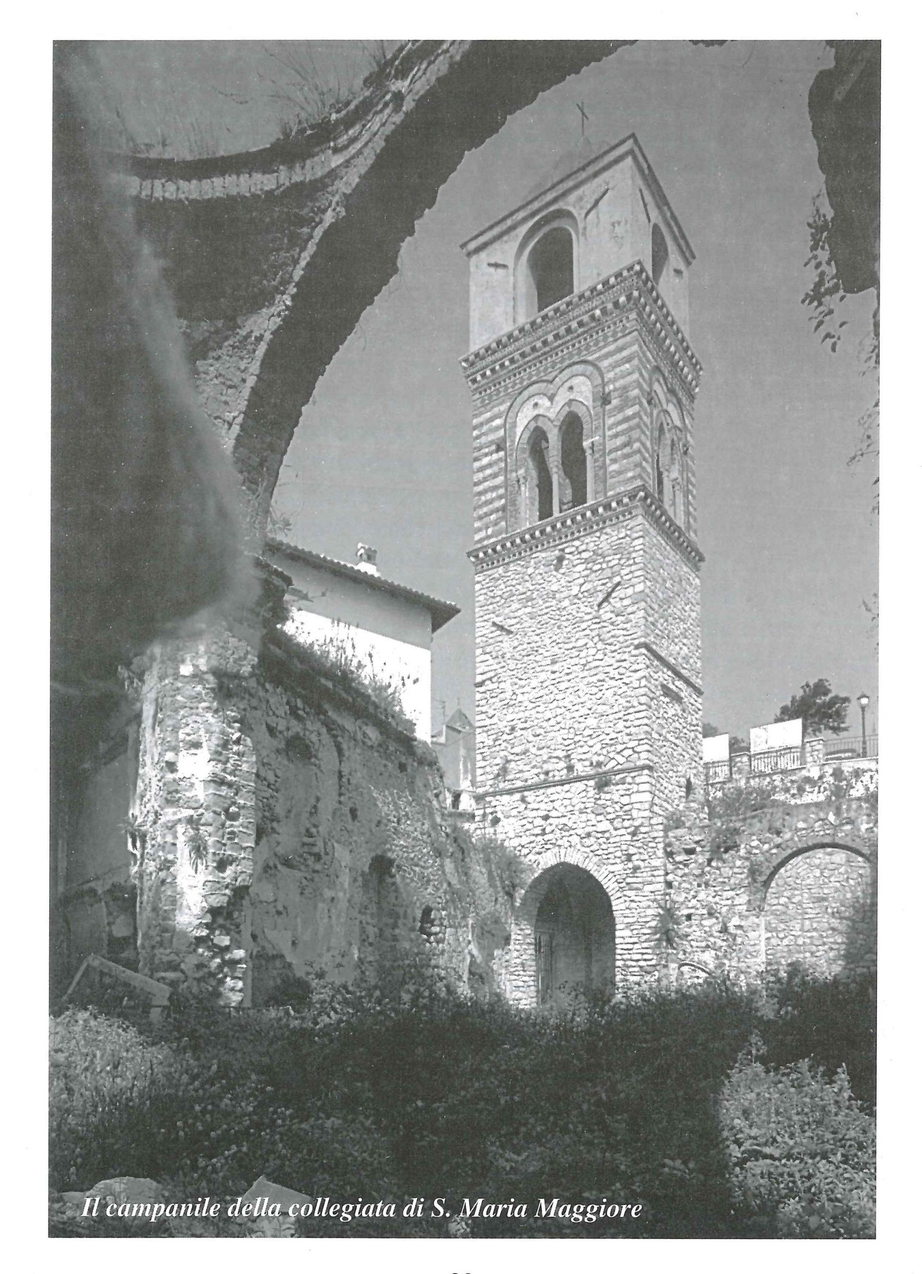 E’ a volte sovrapposte, e di queste volte ve ne erano in origine almeno tre, poiché della terza in alto esistono ancora i peducci e i raccordi. La zona del campanile, che corrisponde all’antica cella campanaria, raccoglie i suoi elementi esterni decorativi da edifici di Roma, di Gaeta, della campagna laziale, delle città dell’Italia marittima meridionale. E’ sopra e sotto limitata da cornicioni romani a modiglioni marmorei, stretti tra le solite riseghe di dentelli destrorsi e sinistrorsi e filari di mattoni formanti listello; in inferiormente alle cornici una o due serie di mattonelle disposte a losanga e di piatti in majolica risaltano coi loro colori vivaci; il paramento murario intermedio a corsi di pietra da taglio intercalati a filari di laterizio, dà un effetto bicromico di bianco e rosso. La bicromìa continua anzi anche nelle finestre. Esse sono di modulo grazioso a bifore di arco acuto con colonnina tortile mediana, e sono inscritte emtro un’altra puiù grande bifora, apparente solo all’esterno, disegnata con muratura di mattone incorniciata di peperino.