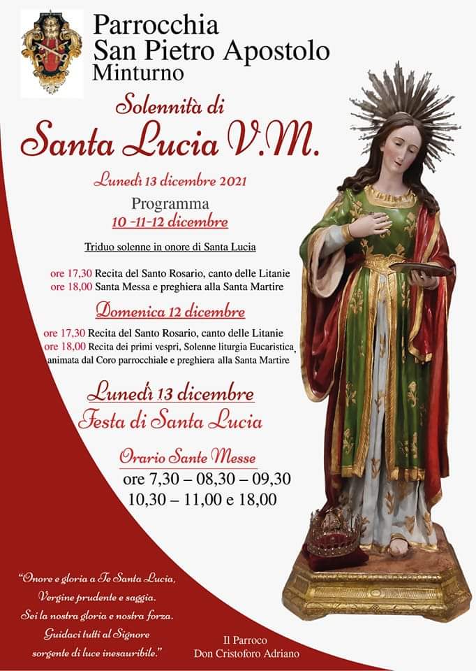 In particolare il vice sindaco Elisa Venturo sin dal giorno della sua prima nomina sta lavorando per questa sentita tradizionale Fiera di Santa Lucia, ovviamente sostenuta e incoraggiata dal primo cittadino Gerardo Stefanelli. Edizione 2021 si sta tenendo nelle vie di Minturno, con un doppio appuntamento nei seguenti orari: Domenica 12 Dicembre dalle ore 6:00 alle 18:00, Lunedì 13 Dicembre dalle ore 6:00 alle 14:00. La fiera si sta svolgendo nella seguente area: Via Principe di Piemonte, Piazza Roma, Via Generale Filippo Ciufo, Via Luigi Cadorna e Piazza XX Agosto. È possibile parcheggiare al Multipiano e a Piazza Kennedy. Stasera alle ore 19 previsti i fuochi pirotecnici visibili da piazza Portanova e dalla villa comunale. W Santa Lucia.