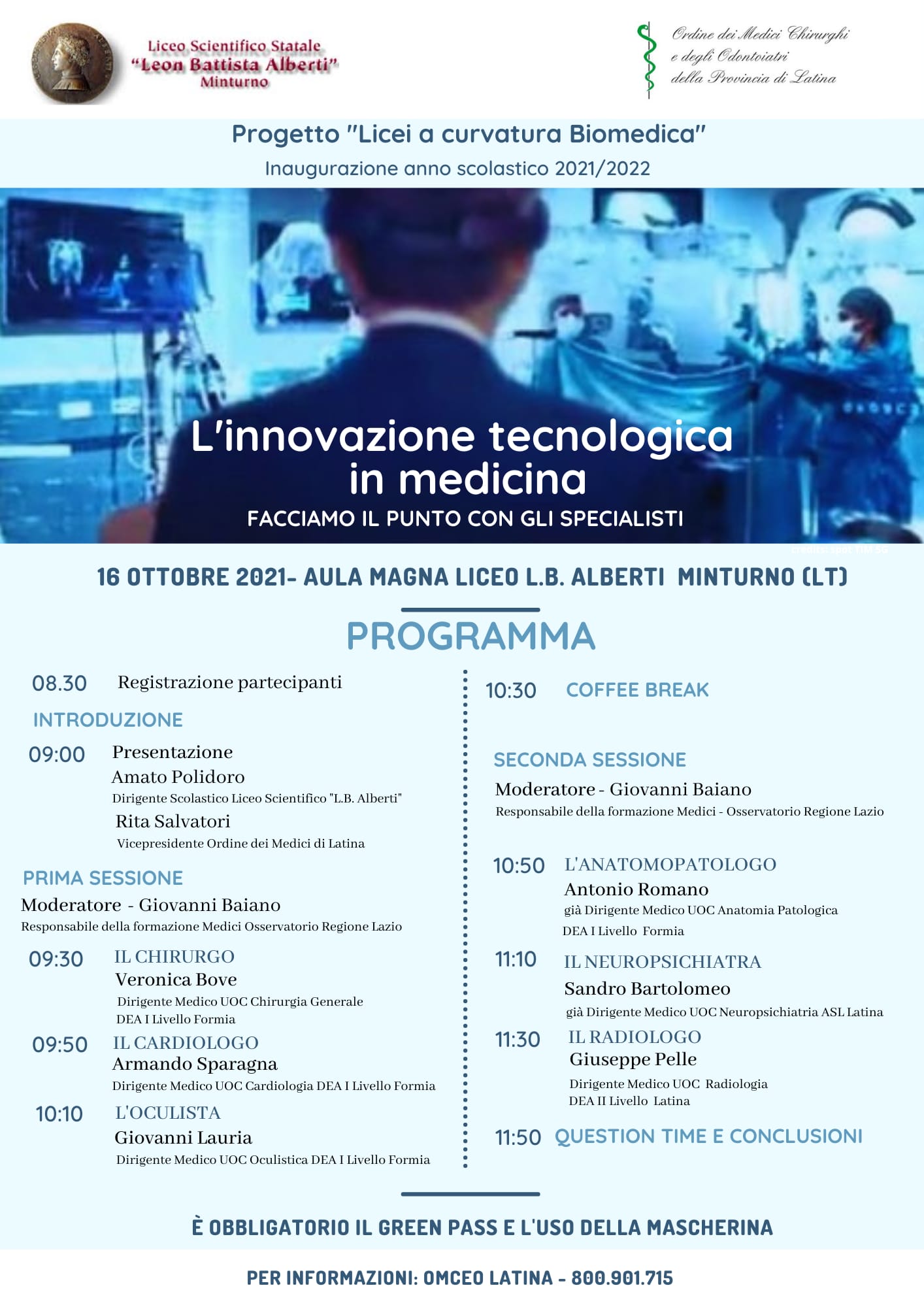 Sabato mattina 16 ottobre nell’Aula Magna Ing. Maurizio Bisegna del Liceo Scientifico Statale Leon Battista Alberti di Marina di Minturno con inizio alle 8.30 si terrà un convegno scientifico che vale come inaugurazione del Corso Biomedico di cui si fregia il Liceo anche grazie al lavoro paziente ma risoluto della vice preside professoressa Caterina Valerio.