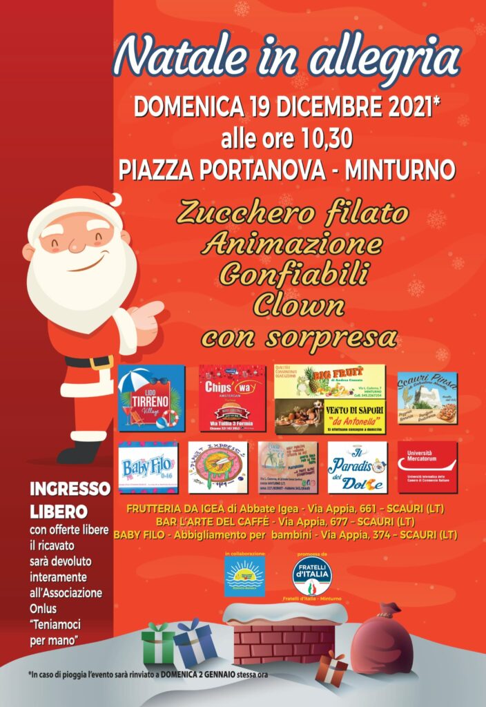 Con l’avvicinarsi delle festività natalizie anche il gruppo del direttivo locale di Fratelli d’Italia di Minturno ha deciso di dare il proprio contributo e far sentire la propria presenza sul territorio nel periodo più atteso dell’anno. Lo fa dedicando qualche ora di divertimento ai bambini: domenica 19 dicembre 2021 a partire dalle 10:30 in piazza Portanova a Minturno ad attenderli ci saranno gonfiabili, animazione, musica, e tante altre sorprese! L’iniziativa è stata promossa anche grazie al supporto di alcune attività commerciali del comprensorio minturnese e l’accesso sarà gratuito. Il tutto senza però dimenticare lo spirito solidale che connota il Natale, infatti tutto l’eventuale ricavato della manifestazione sarà devoluto all’Associazione Onlus “teniamoci per mano”, un gruppo di giovani volontari che da anni portano allegria a chi è meno fortunato di noi praticando la “clown terapia” nei reparti pediatrici e ovunque ci sia bisogno di un sorriso.