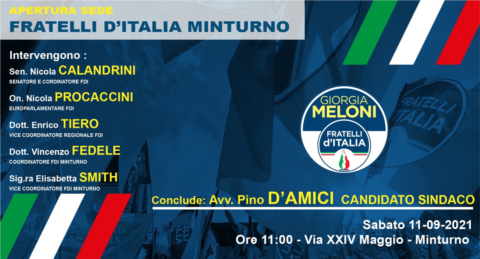 Sabato dalle ore 11 a Minturno, Via XXI Maggio, Fratelli d’Italia inaugurerà la propria sede e con l’occasione presenterà la lista dei candidati al consiglio comunale di Minturno.
