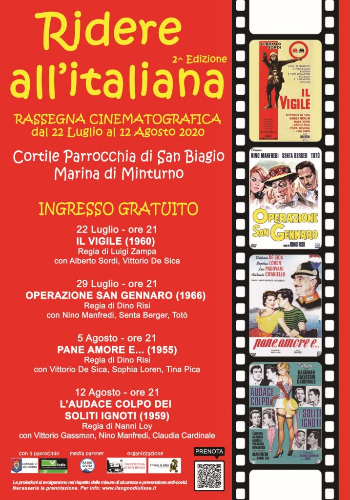 Dal 22 Luglio a 12 Agosto 2020 si svolgerà presso il Cortile della Parrocchia di San Biagio a Marina di Minturno la seconda edizione della rassegna cinematografica “Ridere all’Italiana”, organizzata dall’Associazione Culturale “Il Sogno di Ulisse” e dalla Chiesa di San Biagio, grazie alla sensibilità di Don Maurizio Di Rienzo. L’evento, sotto il patrocinio del Comune di Minturno, si svolgerà nel rispetto delle misure di sicurezza dell’emergenza Covid-19 e del distanziamento sociale con ingresso gratuito e capienza massima di 100 persone (è necessaria la prenotazione).