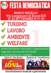 Sabato 21e domenica 22 settembre Festa del Partito Democratico al Parco Recillo di Scauri. Quindi è confermata la scelta della location degli ultimi anni. Lontani ricordi le feste in piazza Santa Albina o in piazza Caio Mario, ma questa volta gli organizzatori hanno evitato l’errore del passato, cioè la coincidenza di data con la Festa della Madonna della Libera, che chiude da sempre il calendario estivo, anzi lo stand gastronomico sarà curato direttamente dall’Associazione Contadina di Fontana Perrelli, veri maestri in tale settore. Per i buongustai promesse culinarie che indurranno a restare tutta la serata.