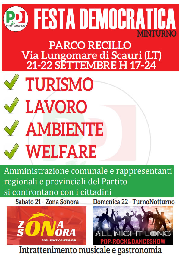 Esponenti del PD si confronteranno con i cittadini sui temi di maggiore interesse quali turismo, lavoro, ambiente e welfare. In programma interventi del sindaco Gerardo Stefanelli, degli assessori regionali Salvatore La Penna ed Enrico Forte, del segretario provinciale Claudio Moscardelli e del sindacalista segretario provinciale Latina – Frosinone Antonio Sessa, nonché di Francesco Meschino responsabile dell’Area Policentrica Sud Pontino, entrambi esponenti della CGIL. Sabato si potrà ascoltare il gruppo musicale Zona Sonora e domenica il gruppo musicale Turno Notturno, che terranno i loro concerti non appena terminati i dibattiti politici. Il segretario della Sezione PD cittadina il consigliere comunale e delegato alla sanità Franco Esposito, autentico galantuomo e generoso politico, ha organizzato – secondo le disponibilità – dei partecipanti confronti e dibattiti a partire dalle 18.30. Sabato Enrico Forte e Antonio Sessa.