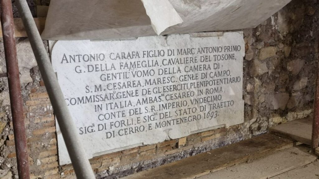 L’intervento di variante in corso d’opera include anche il restauro dell’epigrafe commemorativa di Antonio Carafa, signore di Traetto, della nicchia ad essa sovrapposta che un tempo ospitava il busto marmoreo, e del porticato del cortile che comprende l’interramento delle tubazioni e dei cavidotti.