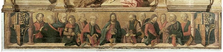Tra il 1495 e il 1498, la storia dell’arte italiana si arricchisce di una pagina fondamentale per lo sviluppo della stessa: Leonardo da Vinci in quegli anni, su commissione di Ludovico il Moro, dipinse la maestosa Ultima Cena del refettorio del convento di Santa Maria delle grazie a Milano, chiesa eletta da Ludovico il Moro a luogo deputato per le celebrazioni legate alla casata Sforza. Tale opera, fu apportatrice di rivoluzionari schemi iconografici che influenzeranno a partire da quegli anni l’iconografia dell’Ultima Cena, ossia Cristo seduto e ai suoi lati gli apostoli, ognuno al proprio posto e, come è possibile notare in gran parte delle opere d’arte presentanti il medesimo soggetto evangelico, l’apostolo Giovanni che poggia la testa in grembo al Cristo come avviene ad esempio in Giotto di Bondone, nella sua Ultima Cena conservata presso l’Alte Pinakhoteke di Monaco, datata tra il 1320 e il 1325.