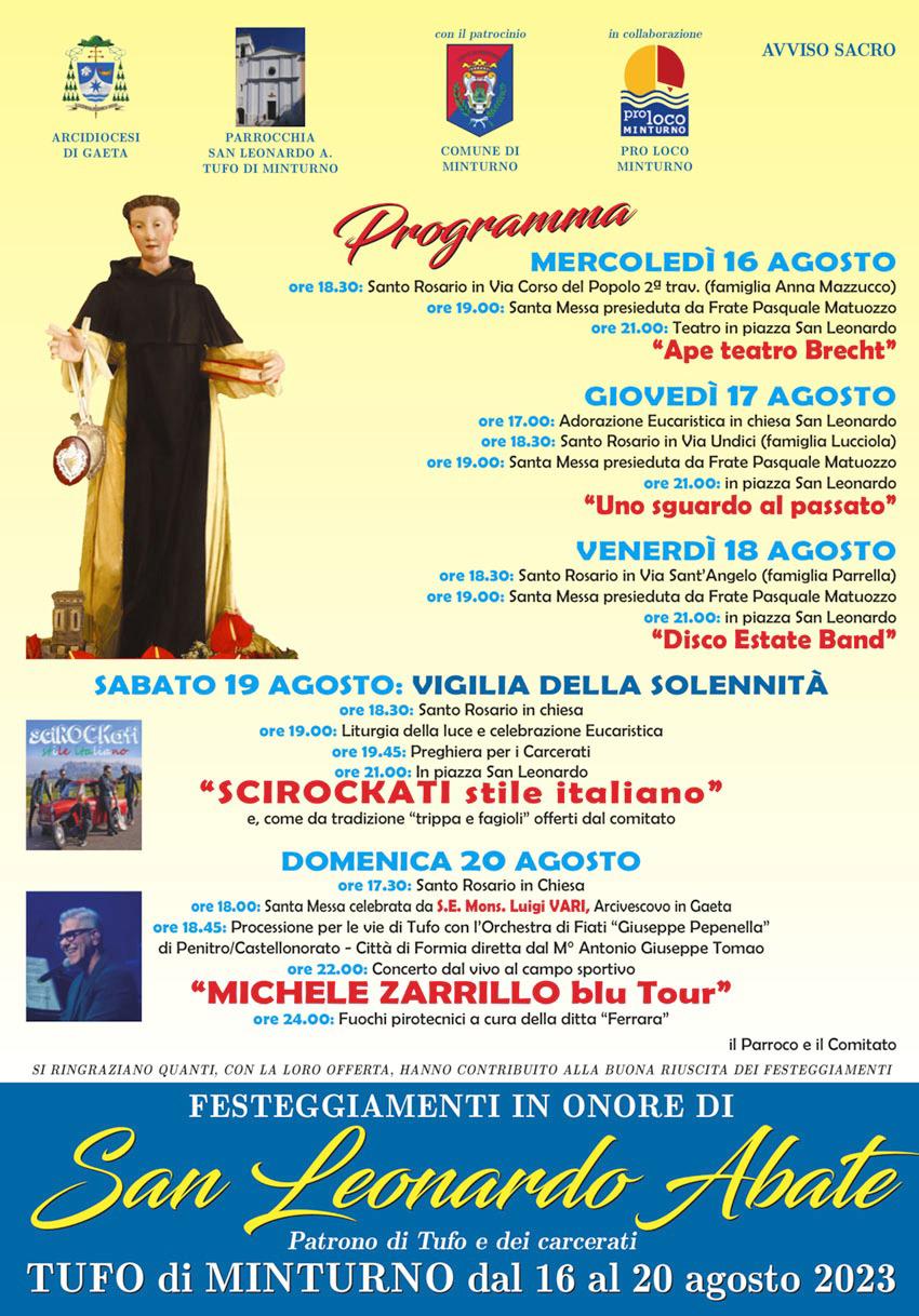 CronacaMinturno Minturno: a Tufo dal 16 al 20 agosto Festa di San Leonardo Tufo in festa 2023 By Marcello Rosario Caliman - Agosto 14, 2023 0 1638 Share FacebookTwitterWhatsApp Padre francescano Agostino offre quest’anno ai parrocchiani e ai villeggianti un ricco programma di eventi che si può rilevare dal programma dettagliato. Si conclude domenica 20 agosto con alle 22.00 nel campo sportivo con Michele Zarrillo blu tour.