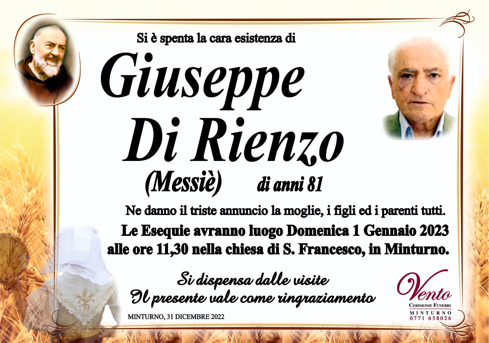 Si è spento a 81 anni Giuseppe Di Rienzo detto da tutti Messiè. Le esequie si terranno oggi domenica 1 gennaio alle ore 11.30 nella Chiesa di San Francesco in Minturno. Hanno dato il triste annunzio la consorte, i figli e i parenti tutti. Tutti i traettesi e non solo conoscevano bene Giuseppe Di Rienzo. Ha lavorato presso il Nosocomio di Minturno quando era ancora un ospedale attivo e lui era responsabile della lavanderia e del magazzino della biancheria. Poi fondò con entusiasmo l’associazione San Marco, un periodico sul folklore minturnese e aprì un negozio di souvenir con bambole vestite con gli abiti in miniatura della pacchiana. Chi scrive ne conserva gelosamente una copia donata da Giuseppe. Ma la sua passione era fondare un museo della cultura contadina. All’inizio trovò ospitalità nella Chiesa sconsacrata di San Biagio V.M. poco distante dalla Chiesa di San Pietro. Poi il progetto di ospitalità presso il Castello Ducale Caracciolo Carafa. Sognava di fondare un’associazione per amministrare il museo e pensava – mi disse – di affidare la presidenza al compianto architetto D’Angelo, funzionario comunale deceduto per un male incurabile in breve tempo. Mi chiede di seguire le ricerche storiche e l’ufficio stampa. Poi si è arreso anche lui afflitto dalla malattia di cui era perfettamente consapevole. Che Dio l’accolga con amorevole cura.