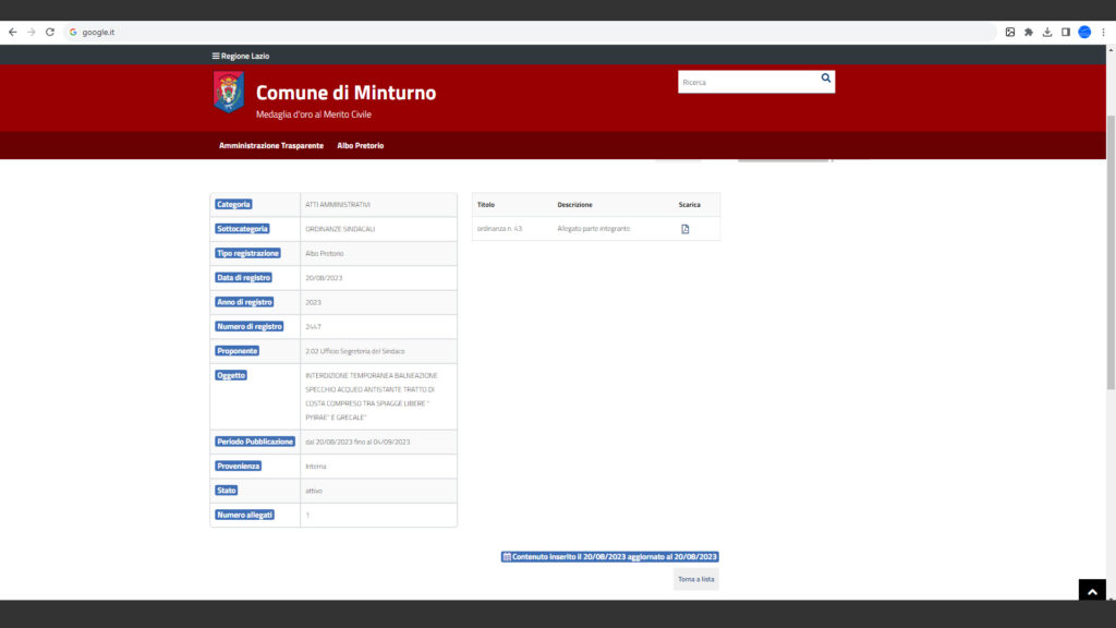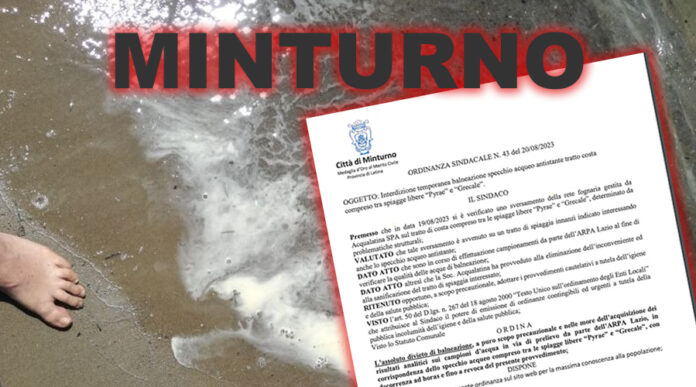 Minturno: balneazione temporaneamente interdetta. Ecco dove. Ordinanza sindacale n°43 – Con l’ordinanza sindacale n°43 del 20 agosto 2023 del Comune di Minturno il Sindaco ordina l’assoluto divieto di balneazione, a puro scopo precauzionale e nelle more dell’acquisizione dei risultati analitici sui campioni d’acqua in via di prelievo da parte dell’ARPA Lazio, in corrispondenza dello specchio d’acqueo compreso tra le spiagge libere Pyrae e Grecale con decorrenza ad horas e fino a revoca del presente provvedimento. Di seguito l’ordinanza: