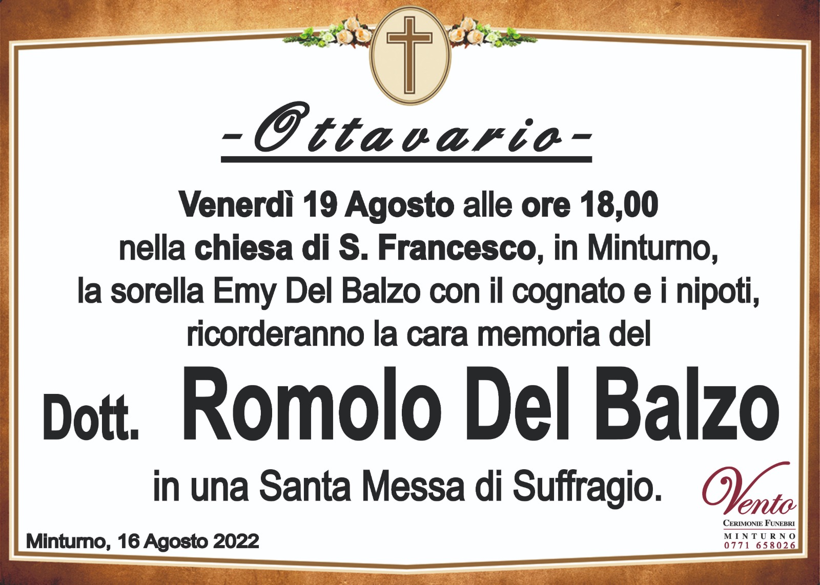 Emy Del Balzo, sorella di Romolo Del Balzo, a nome suo e dei tre figli Antonia, Giovanni e Nicoletta, nipoti dell’indimenticabile fratello, nonchè del cognato Nicola Pimpinella, ha promosso per venerdì 19 agosto alle ore 18.00 presso la Chiesa di San Francesco in Minturno una messa di suffragio. La scelta non è casuale: sin dai tempi d’oro della leadership di Severino Del Balzo a Minturno e in Provincia la famiglia tutta è devota al culto francescano. Con l’occasione si pregherà anche per i genitori di Emy e Romolo Del Balzo: i coniugi Maria e Severino. A tal proposito sono affissi per la città i manifesti di annunzio della funzione.