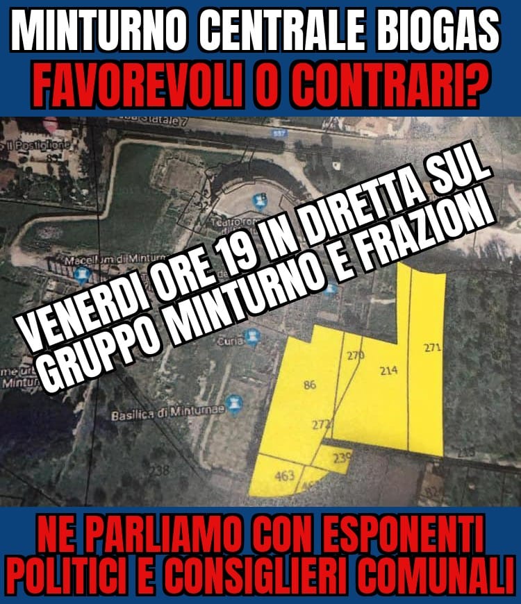 Marco Moccia, esponente a Minturno dei Fratelli d’Italia, comunica che questo venerdì 15 maggio vi sarà una diretta straordinaria sul gruppo Facebook “Minturno e Frazioni”. A tal proposito precisa: “Dalle ore 19 parliamo della Centrale Biogas che dovrebbe sorgere a Marina di Minturno. Tra favorevoli e contrari diamo voce a tutti”. Procediamo con ordine. Nel mese di marzo sul nostro Magazine Golfo e Dintorni abbiamo pubblicato un’inchiesta a più pagine sulla realizzazione dell’impianto Centrale Biogas a poche centinaia di metri dall’Area Archeologica di Minturnae. In tale occasione ospitammo la posizione nettamente contraria a tale realizzazione da parte del Movimento 5 Stelle. Nei giorni scorsi è stata la Lega a rendere pubblica la sua posizione del tutto contraria. Dopo di che abbiamo chiesto a Marco Moccia di espletare la posizione del partito di Giorgia Meloni.