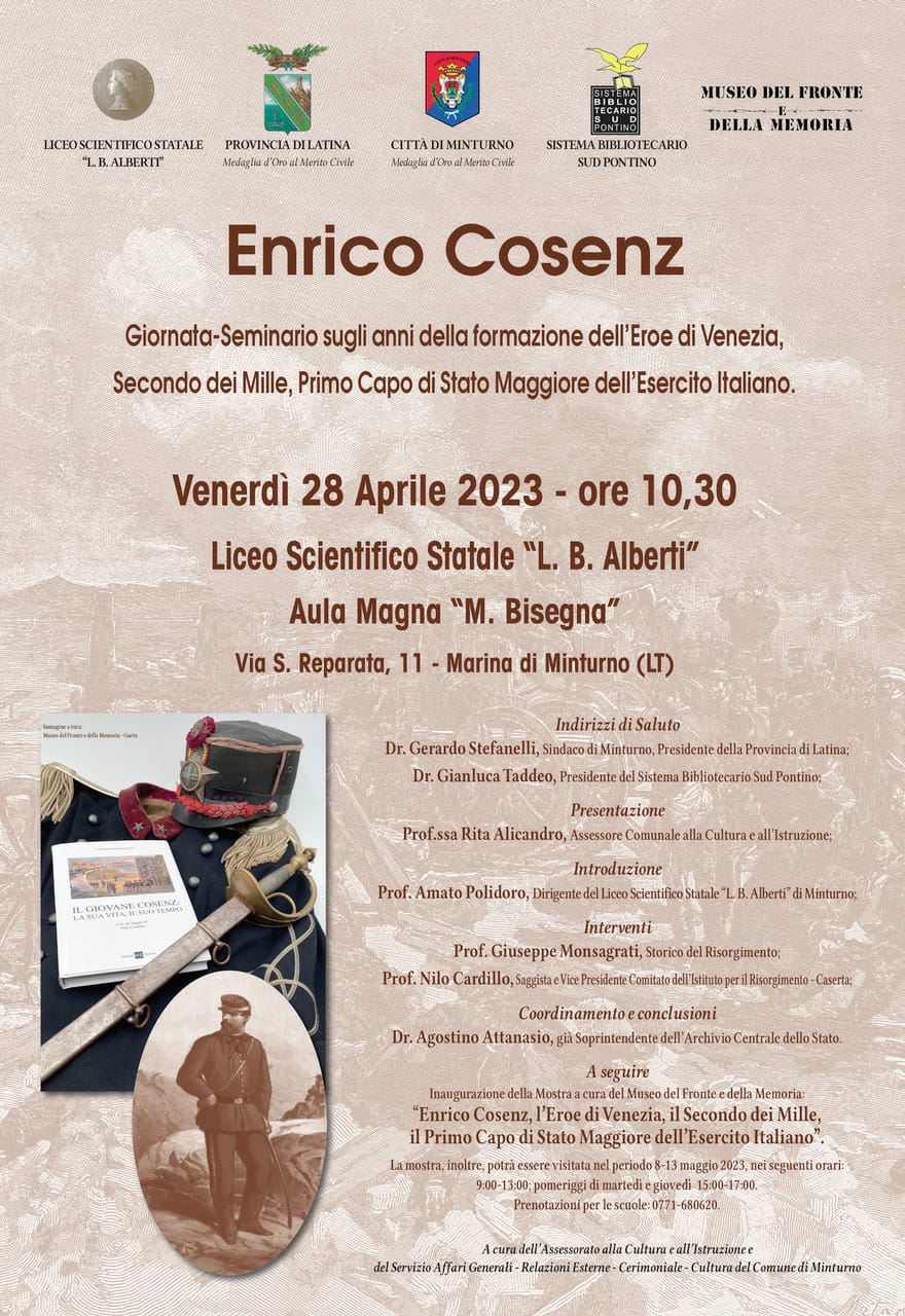 Grazie alla preziosa disponibilità del dirigente scolastico Amato Polidoro il Liceo Scientifico Statale Leon Battista Alberti di Marina di Minturno venerdì 28 aprile ospiterà un convegno e l’apertura di una mostra dedicata a Enrico Cosenz (nella foto di copertina). È stato un militare e politico italiano, allievo della prestigiosa Scuola Militare Nunziatella di Napoli, ufficiale dell’esercito delle Due Sicilie; eroico difensore di Venezia, passò nelle file di Garibaldi e fu poi generale dell’Esercito Regio, capo di Stato Maggiore, deputato e infine senatore del nuovo Regno d’Italia. Era nato a Gaeta il 12 gennaio 1820, si spegnerà a 78 anni a Roma il 28 settembre 1898. Gli interventi previsti e le varie modalità sono descritte in modo dettagliato nell’allegata locandina.
