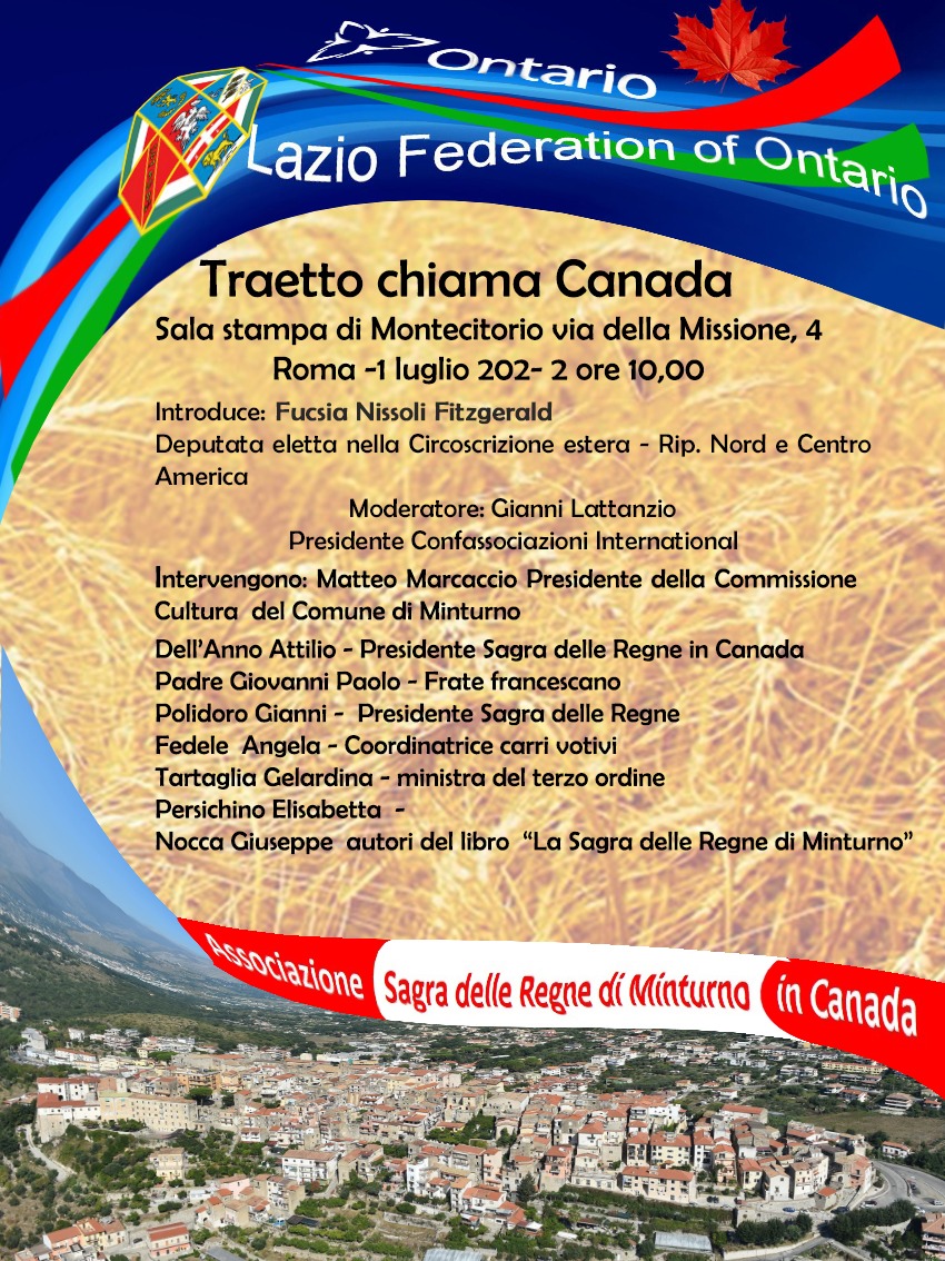 Di contro da parte sua il presidente dell’Associazione Sagra delle Regne di Minturno in Canada Attilio Dell’Anno osserva: “incontrato il presidente dell’Associazione Sagra delle Regne di Minturno, Gianni Polidoro de Le Tradizioni, per una conferenza stampa su Traetto chiama Canada con Gianni Lattanzio, presidente Confassociazioni International, presso l’Ufficio Stampa del Parlamento italiano alla presenza dell’ On. Fucsia Angela Fitzgerald Nissoli, con il presidente della Commissione Cultura del Comune di Minturno Matteo Marcaccio; Padre Giovanni Paolo del Convento francescano di Minturno; Angela Fedele coordinatrice carri votivi; Geraldina Tartaglia ministra del terzo ordine; Elisabetta Persichino e Giuseppe Nocca, autori del libro “La Sagra delle Regne di Minturno – Una Rilettura Antropologica; sono intervenuti all’evento: Ciufo Antonio Emilio Dirigente Ministero Sviluppo Economico, Conte Maria I Giullari, De Meo Giorgio Sbandieratori Borghi Minturno, D’Urso Lucia, Innesti Cesarina Sbandieratori Borghi, Lorusso Maria Carmela V.P. Sagra Regne in Canada Taddeo Paolo Tartaglia Lino, Verrengia Stanislavo”.