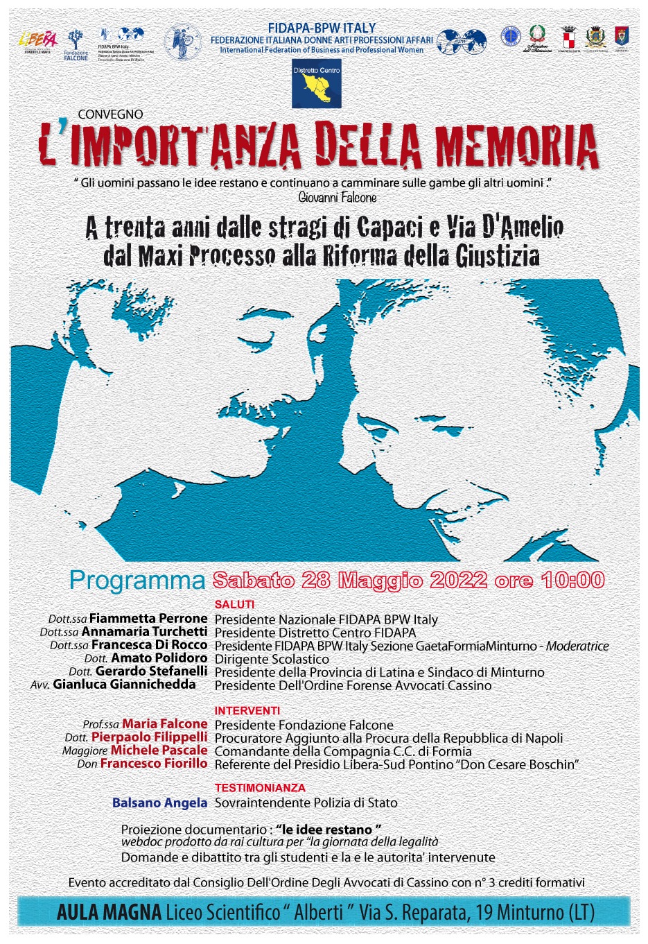 Sabato 28 maggio prossimo grazie alla costante disponibilità del dirigente scolastico Amato Polidoro, da sempre indiscusso protagonista di tutte le campagne a sostegno della legalità, l’Aula Magna Ing. Maurizio Bisegna del Liceo Scientifico Statale Leon Battista Alberti sul tema “L’Importanza della Memoria” a trenta anni dalle stragi di Capaci e di Via D’Amelio, dal maxi processo alla riforma della giustizia. Interventi di pregio: professoressa Maria Falcone, presidente della Fondazione Falcone; dott. Pierpaolo Filippelli procuratore aggiunto alla Procura della Repubblica di Napoli; maggiore Michele Pascale, comandante della Compagnia Carabinieri di Formia; don Francesco Fiorillo, referente del Presidio Libera Sud Pontino “Don Cesare Boschin”. Testimonianza Angela Balsano, Sovraintendenza Polizia di Stato. Vi sarà la proiezione del documentario “Le idee restano”. Evento accreditato dal Consiglio dell’Ordine degli Avvocati di Cassino con tre crediti formativi.