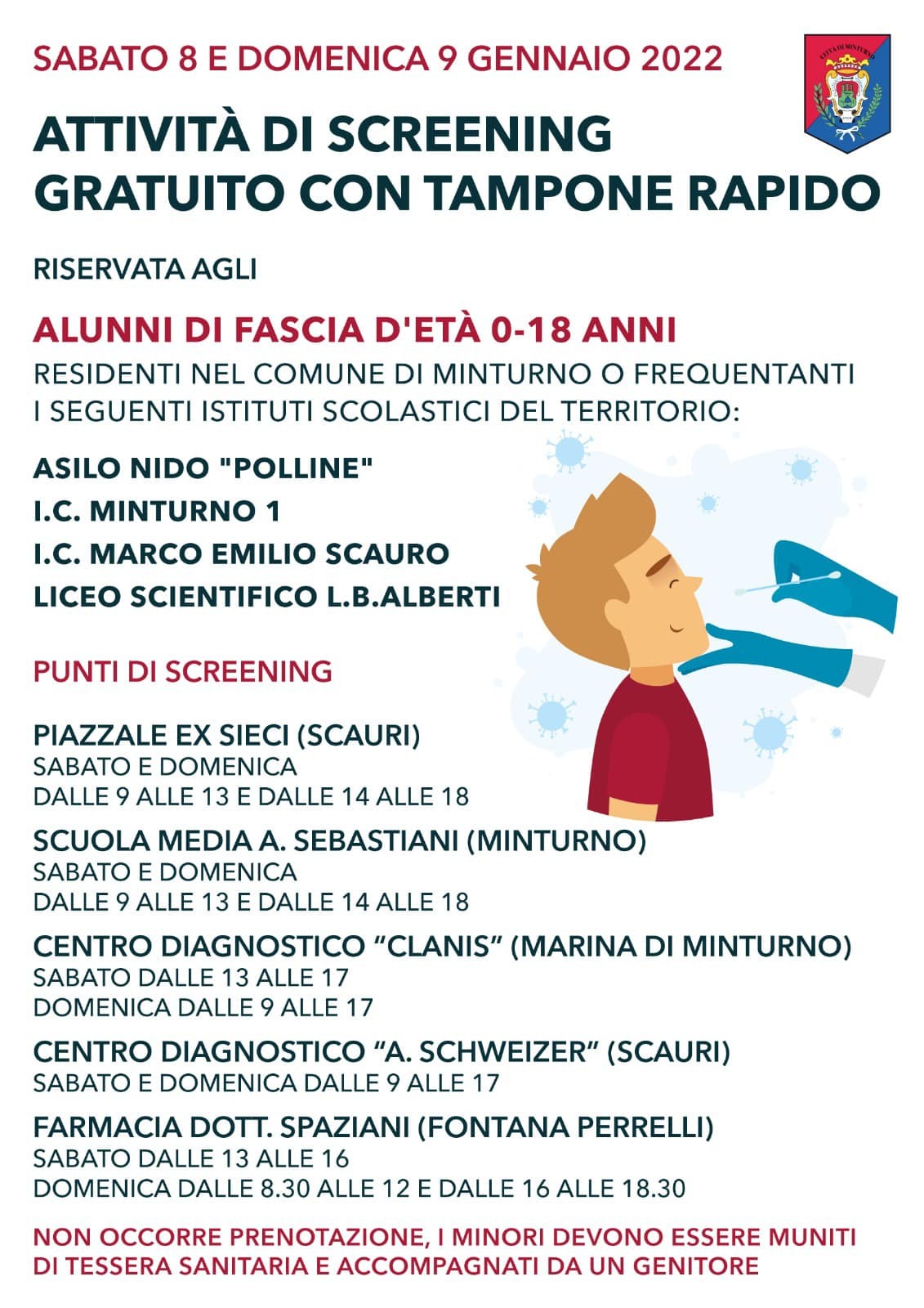 Minturno – Tamponi gratis per il rientro a scuola – Il Comune di Minturno ha organizzato un’attività di screening GRATUITO per il rientro sicuro a scuola. Sabato 8 e Domenica 9 gennaio tutti gli alunni in fascia scolastica da 0 a 18 anni, residenti nel Comune di Minturno o frequentanti gli istituti presenti sul territorio comunale, possono usufruire di questo servizio!Per accedere è sufficiente che i minori, accompagnati da uno dei due genitori, si presentino nelle fasce orarie indicate in uno dei punti di screening muniti di tessera sanitaria. Non è richiesta la prenotazione.