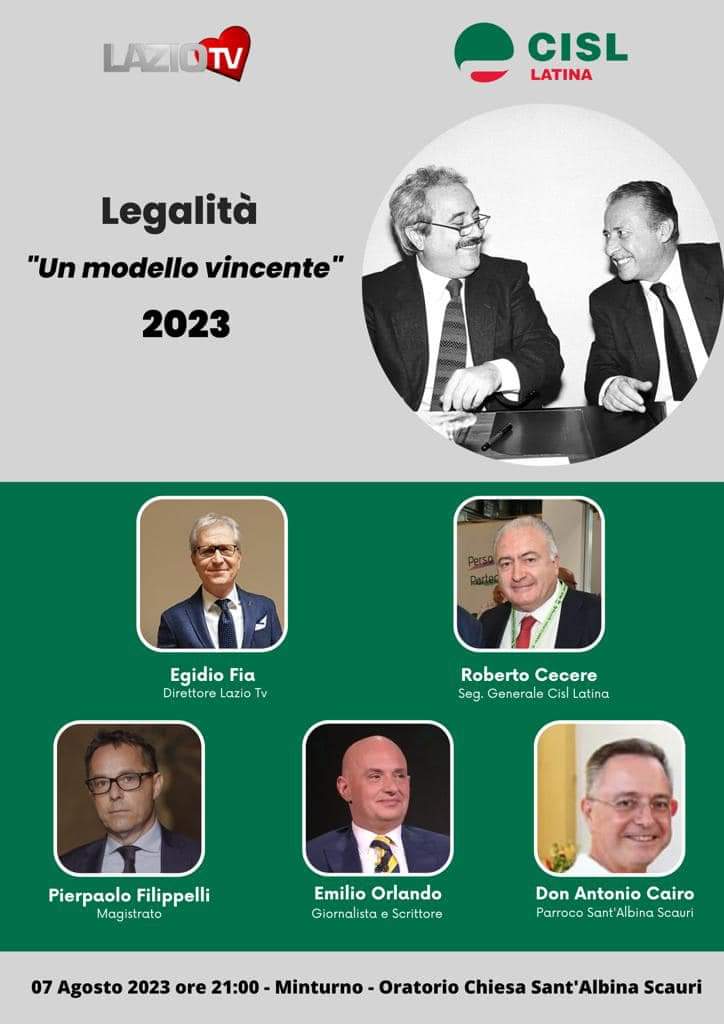 L’emittente televisiva Lazio TV e il sindacato CISL di Latina hanno promosso una tavola rotonda su “Legalità un modello vincente” presso l’Oratorio Chiesa di Santa Albina in Scauri, grazie alla disponibilità del parroco don Antonio Cairo. L’emittente televisiva vede la presenza del direttore Egidio Fia, il sindacato è rappresentato da Roberto Cecere, segretario generale CISL di Latina. Inoltre il giornalista e scrittore Emilio Orlando. La locandina mostra un’immagina celebre di Falcone e Borsellino, due eroi della magistratura. E non poteva quindi mancare la presenza di un magistrato figlio della nostra terra Pierpaolo Filippelli. Si è sempre fatto onore nella sua carriera dovunque ha prestato servizio. Anni fa è stato premiato in sala consiliare del Comune di Minturno con il Premio Civis Minturnarum istituito a suo tempo dall’Azienda Autonoma di Soggiorno e Turismo di Minturno Scauri e al suo scioglimento trasferito con delibera unanime del consiglio di amministrazione a Italia Nostra. Cosa è la legalità? E cosa è invece l’illegalità? Un filo sottile li divide. Ci confrontiamo con questo dilemma quotidianamente. Tutti, nessuno escluso.