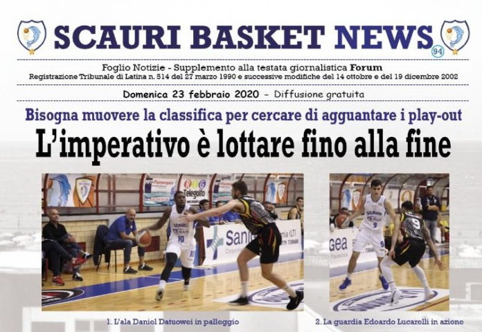 È in uscita il numero 94 del foglio notizie “Scauri Basket News”, supplemento alla testata giornalistica “Forum”, fondata nel 1990. A partire da venerdì 21 febbraio verrà distribuito gratuitamente nelle principali edicole della cittadina del Sud Pontino. Sarà diffuso anche al Palasport Borrelli, in occasione del match di serie B SILVA GROUP SCAURI – LUISS ROMA, in programma domenica 23 febbraio, alle ore 18. Tra le curiosità del “news-sheet”, la rubrica “Le foto della settimana”, le interviste alla guardia Pio Federico Venturo ed all’ex giocatore biancazzurro Mauro Treglia. La realizzazione puntuale del periodico la si deve al giornalista Antonio Lepone, che, peraltro, è stato il primo direttore responsabile della testata giornalistica Forum quando fu fondata.