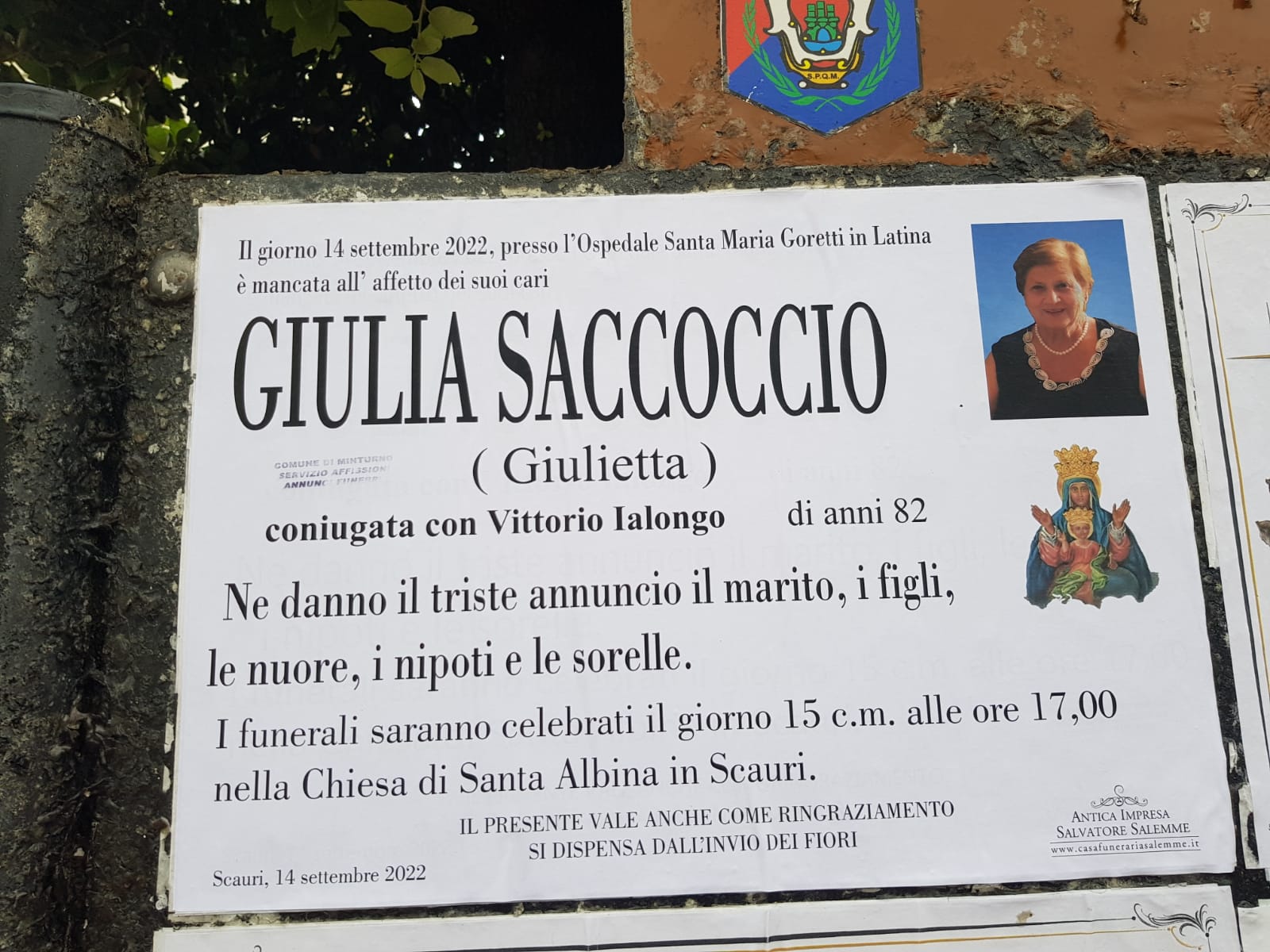 Oggi alle ore 17.00 si terranno le esequie di Giulia Saccoccio, detta Giulietta, di 81 anni, consorte di Vittorio Ialongo. E’ morta nel nosocomio dell’Ospedale Santa Maria Goretti di Latina. Appartiene a una famiglia di artigiani, esperti in tendaggi e tappezzeria. Stimata da tutti i suoi compaesani, si faceva apprezzare per il suo sorriso e la sua naturale cortesia. Ora il commercio e l’artigianato sono mutati, gli imprenditori a conduzione familiare vedono intorno a loro una concorrenza spietata fatta da imprenditori stranieri e ipermercati. Giulia appartiene a un mondo che non va dimenticato e sempre onorato. Un abbraccio cara Giulietta.