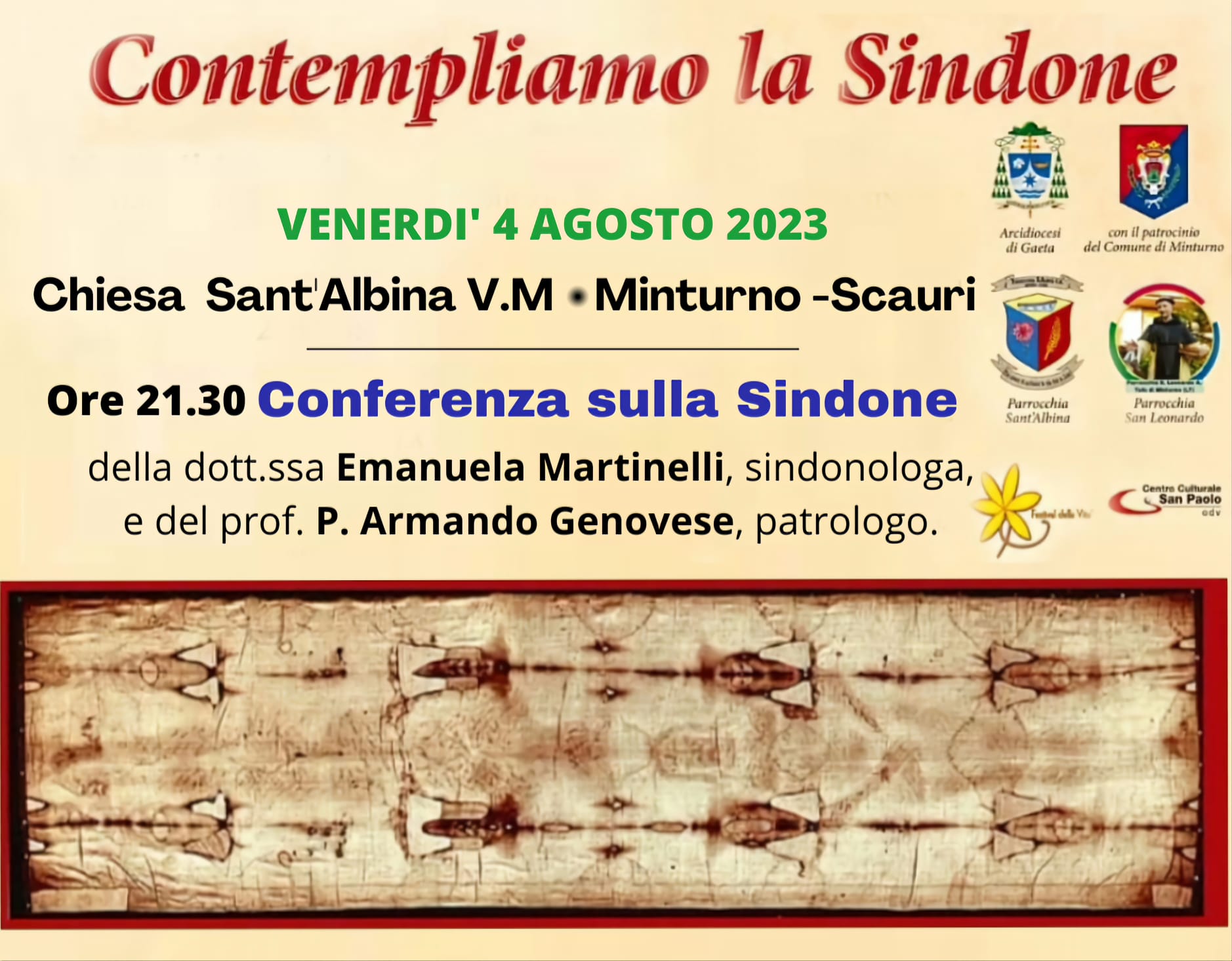 Minturno Scauri: stasera venerdì ore 21.30 contempliamo la Sindone con due esperti, progetto vincente di Santa Albina e San Leonardo di Tufo La Sacra Sindone a Scauri By Marcello Rosario Caliman - Agosto 4, 2023 0 1294 Share FacebookTwitterWhatsApp Evento da non perdere che chiude un ciclo di appuntamenti e di riflessioni tra Tufo di Minturno e Scauri Santa Albina VM, grazie all’amicizia sincera tra don Antonio Cairo e padre Agostino, francescano.