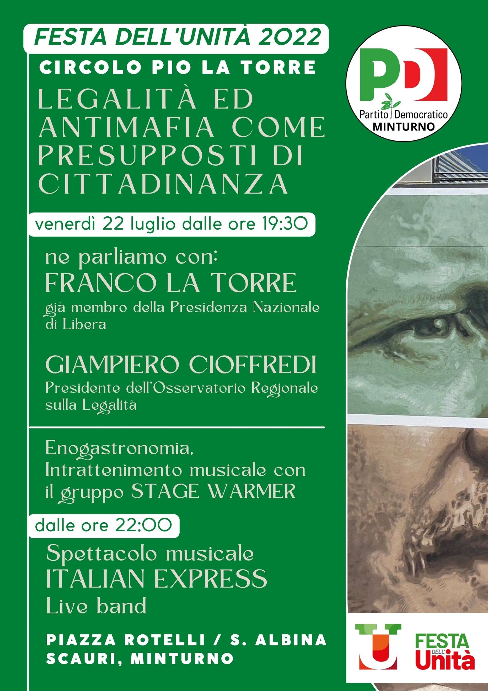 Il segretario del PD di Minturno Lorenzo Corea annunzia “TORNA LA FESTA DE L’UNITÀ” del Partito Democratico di Minturno: Ci eravamo lasciati nel 2019 con un arrivederci al 2020. Purtroppo non è stato così per le note vicende legate alla pandemia. Domani Venerdì 22 luglio a Scauri, in Piazza Rotelli, torna la Festa de L’Unità. È un importante momento di aggregazione, di confronto, di dibattito, di proposta politica, e di buona musica, a cui tutti sono invitati a partecipare. La Festa è un momento di apertura del PD alla città, per incontrare le persone in un clima di confronto e di dialogo, per raccogliere proposte e sollecitazioni e per condividere l’idea che la Politica è l’unico strumento che abbiamo per coltivare interessi collettivi. Per questo ci auguriamo che siano in tanti a partecipare. Quest’anno il tema della festa de sarà “Legalità e Lotta alla mafia come presupposti di Cittadinanza”. Gli ospiti della serata saranno lo storico Franco La Torre, figlio di Pio, a cui è intitolato il nostro circolo, (nella foto di copertina) e Giampiero Cioffredi, presidente dell’osservatorio regionale sulla legalità. Un ringraziamento particolare va a tutti coloro che hanno contribuito, sostenuto e collaborato alla realizzazione della Festa. Buona festa de l’Unità!
